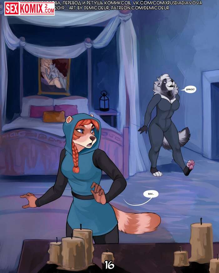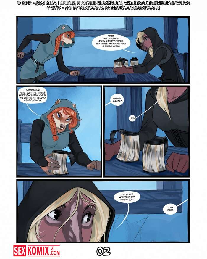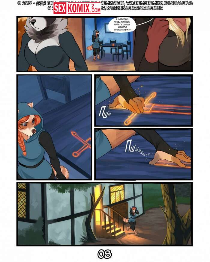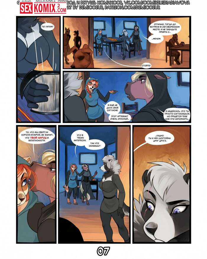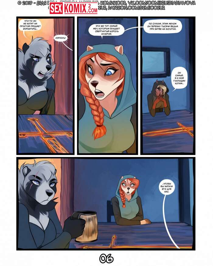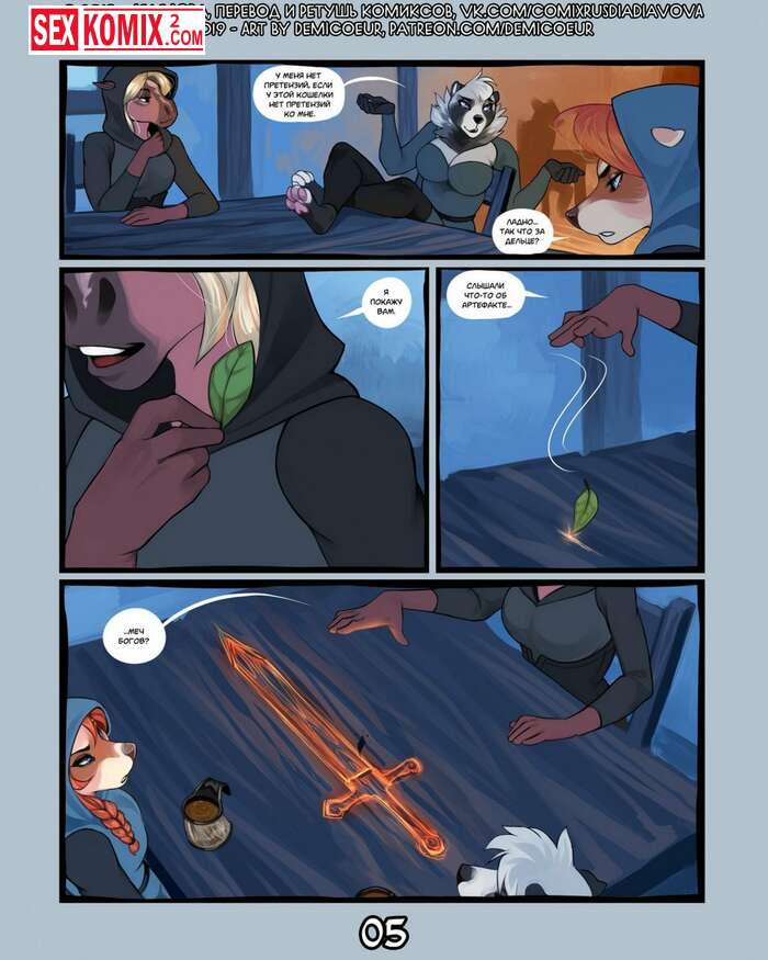 Порно комикс Фурри Меч Богов. Девушка воин отдыхала в трактире после похода. И на её столе возник волшебный меч, он позвал её на приключения. Девушка взяла с собой помощников и отправилась в путь.