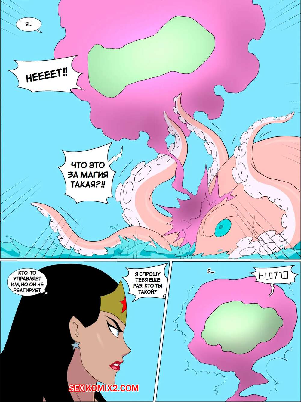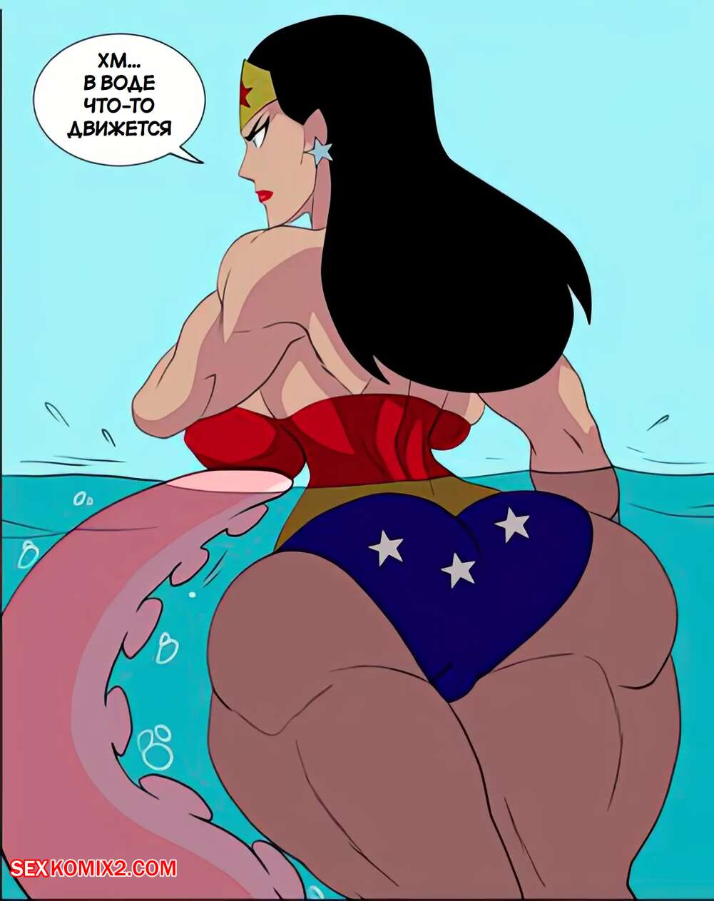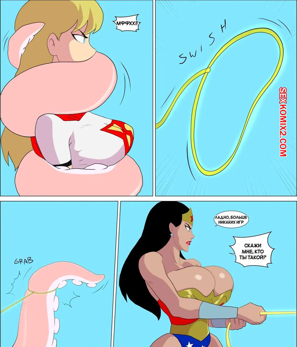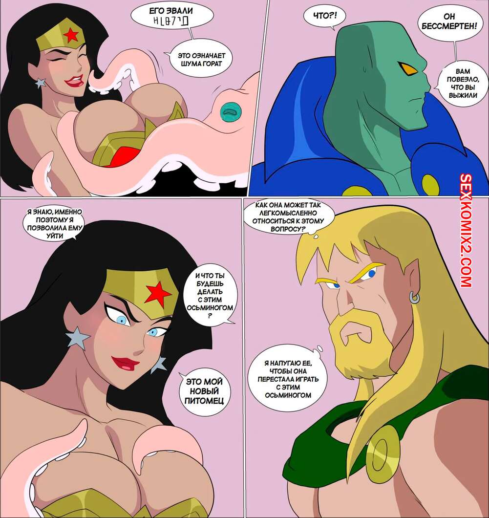 Порно комикс DC. Чудо Женщина против нарушителя. Wonder Woman vs The Intruder Во время своего полета Чудо Женщина обнаружила блеск в воде. Девушка встретила осьминога, который стал ласкать ее дырочки, поэтому она решила взять его на базу Лиги справедливости, чтобы продолжить веселиться.