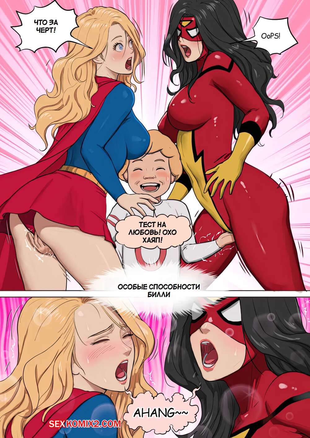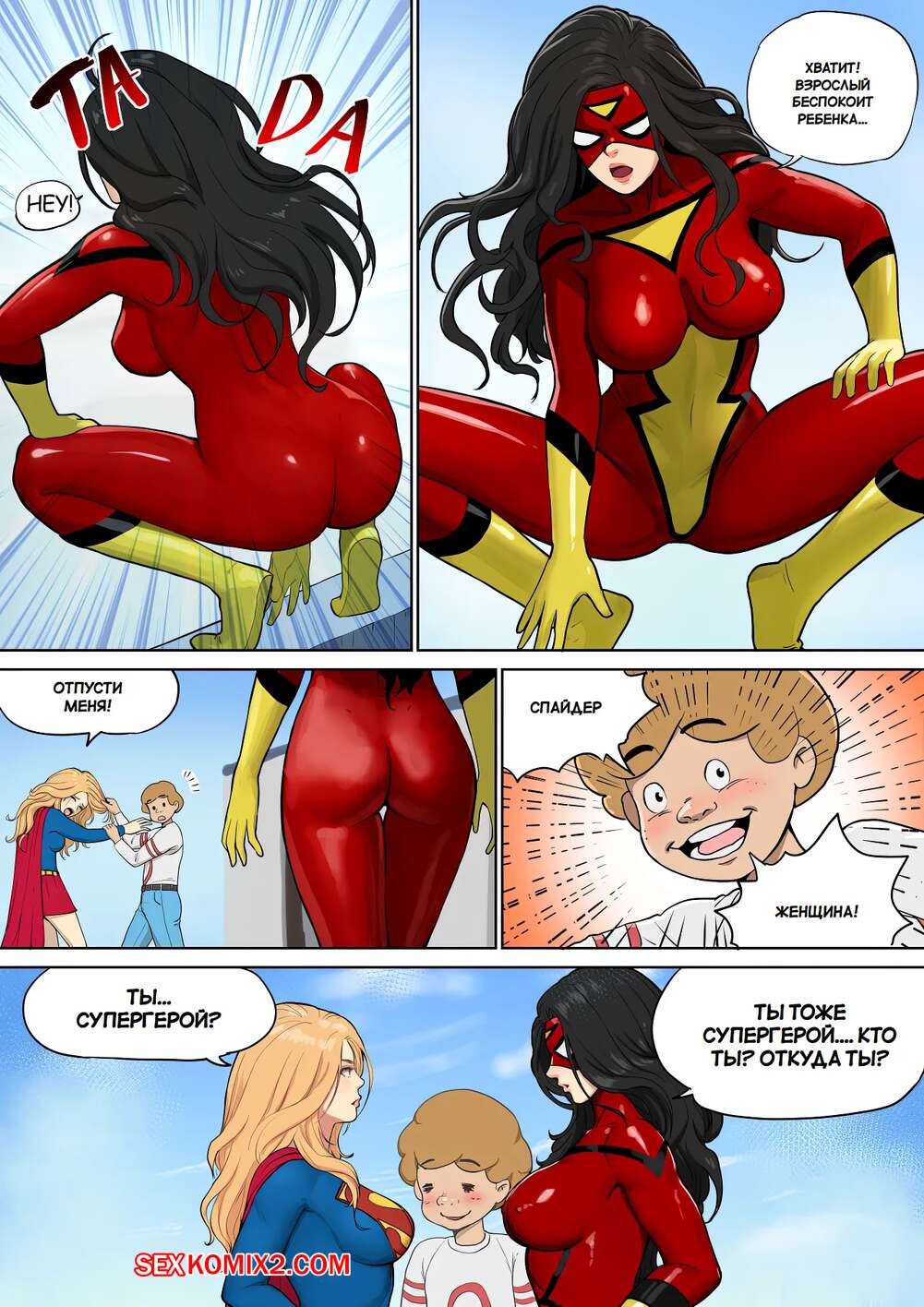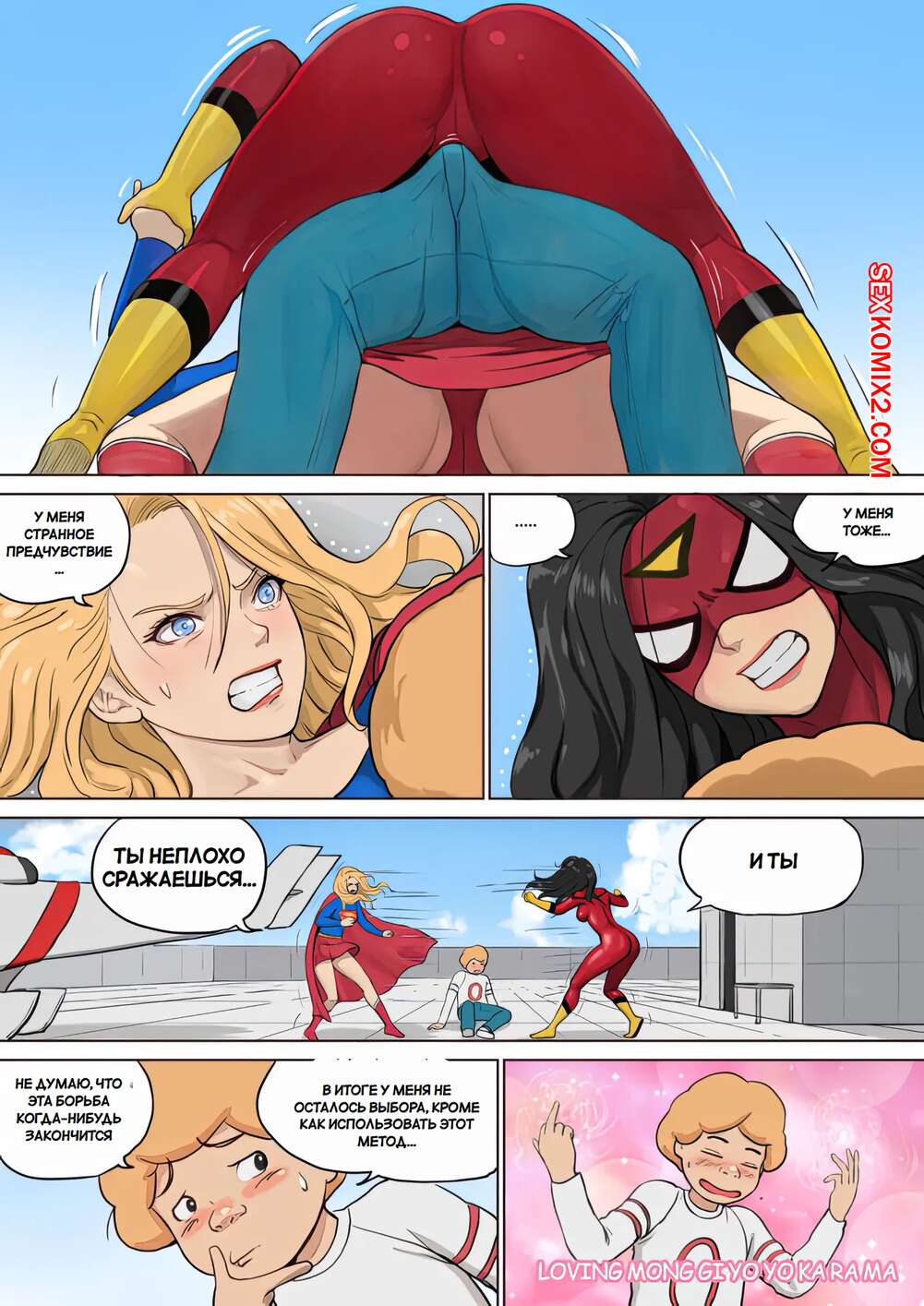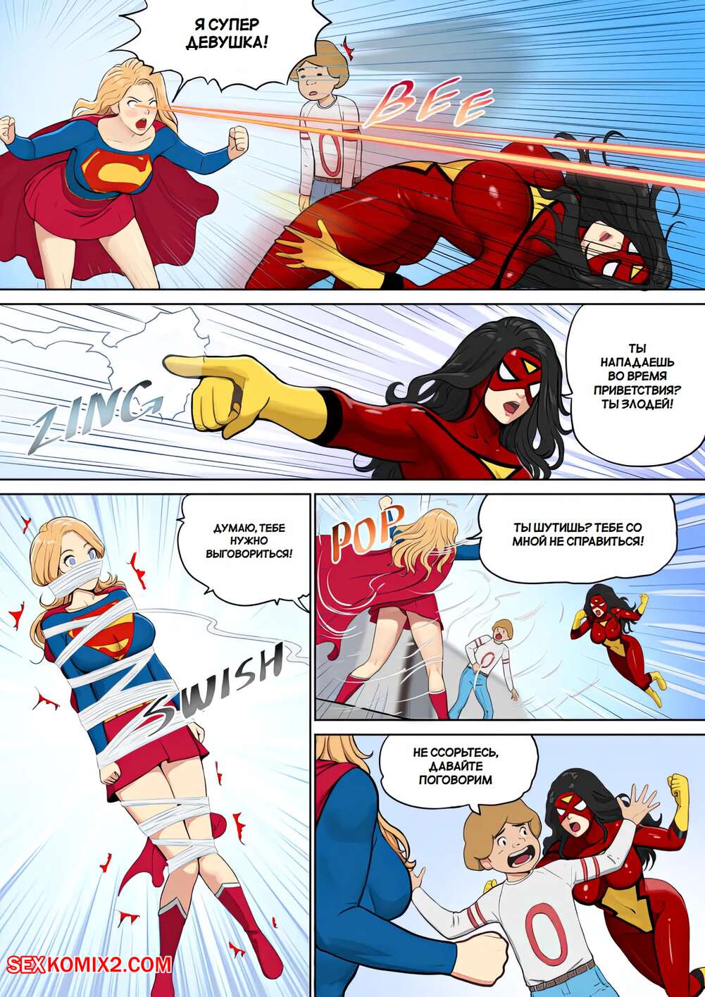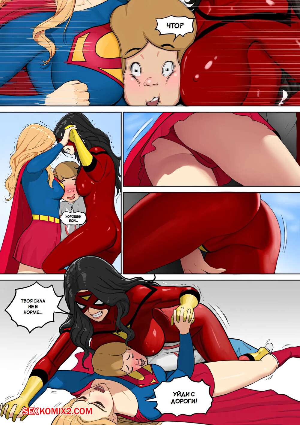Порно комикс Супергерл и Женщина Паук. Supergirl and Spiderwoman. Mezzo. Горячая брюнетка Женщина паук застала на крыше Супергерл и вступила с ней в схватку. Между ними был зажат молодой парень, который возбудился от шикарных тел девушек и стал ласкать их пизденки.