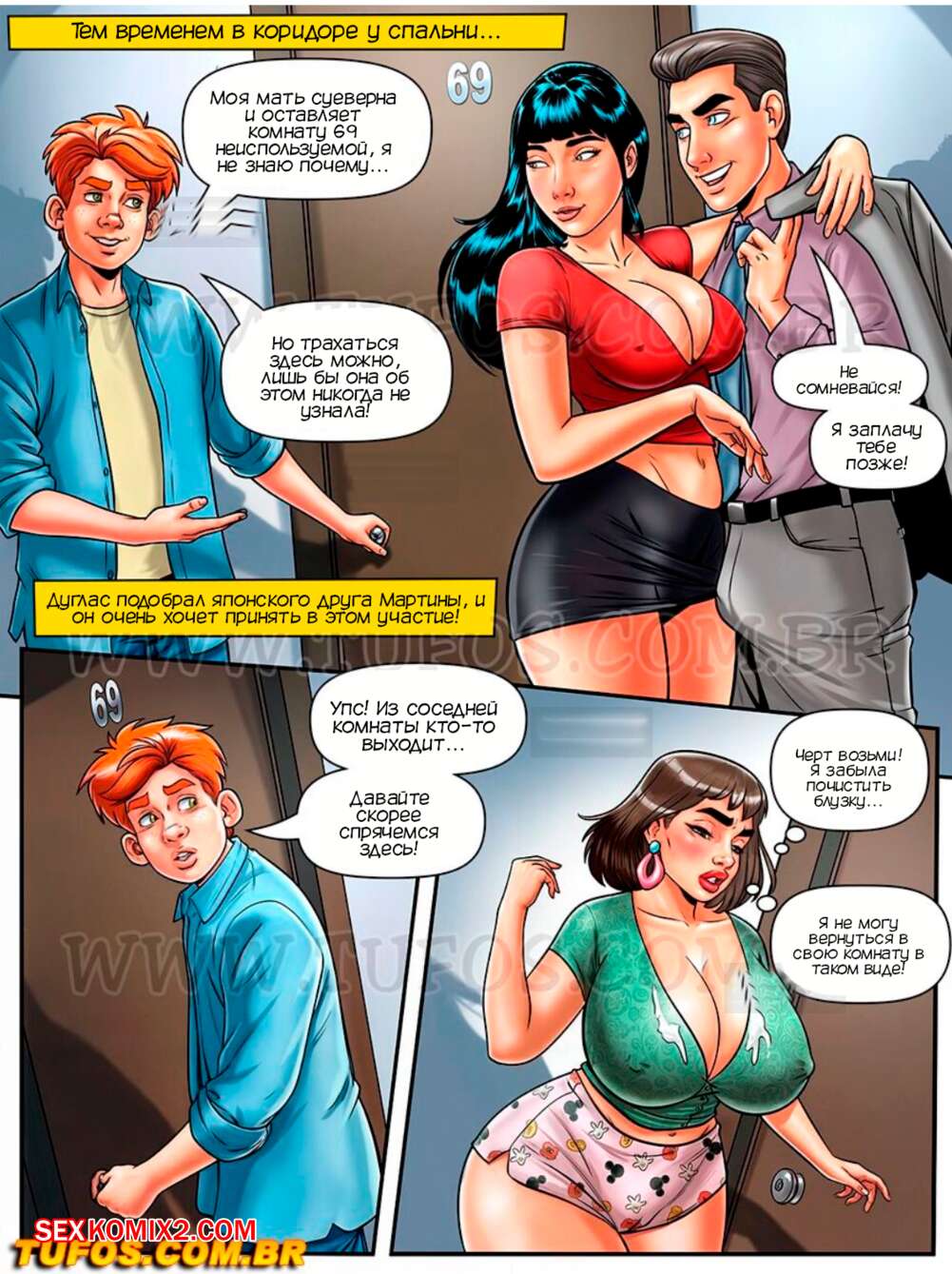 Порно комикс Донья Мама. Часть 3. Dona Mama a maezona da galera. Tufos Горячая милфа застала своего сына, его друга с девушкой в комнате 69, куда всем запрещено заходить. Сержиньо быстро оттуда убежал, а красотка решила повеселиться с молодой парой и помочь им потрахаться.