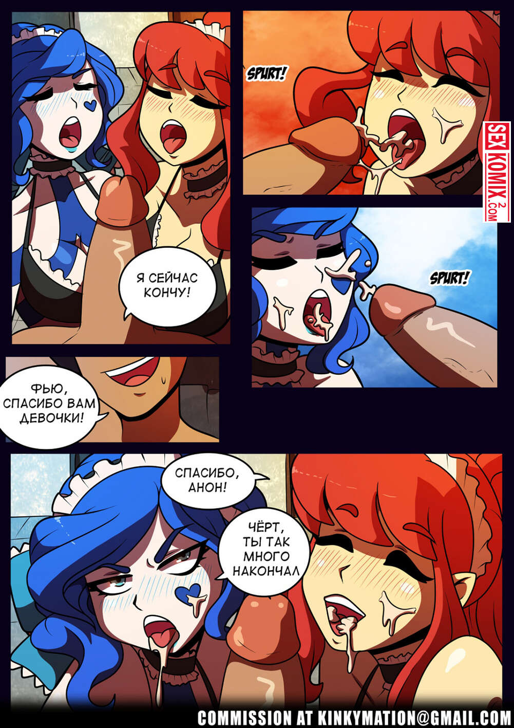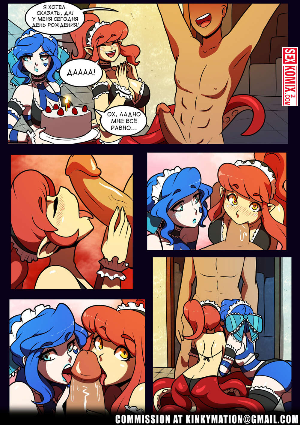 Порно комикс Горничные на день рождения. Kinkymation. Девушки подготовили особенный подарок парню на день рождения. Они испекли ему огромный торт, а вишенкой стали их сочные киски, который нужно трахнуть.