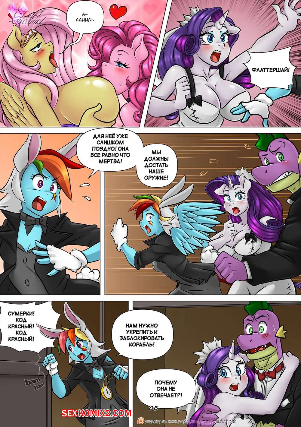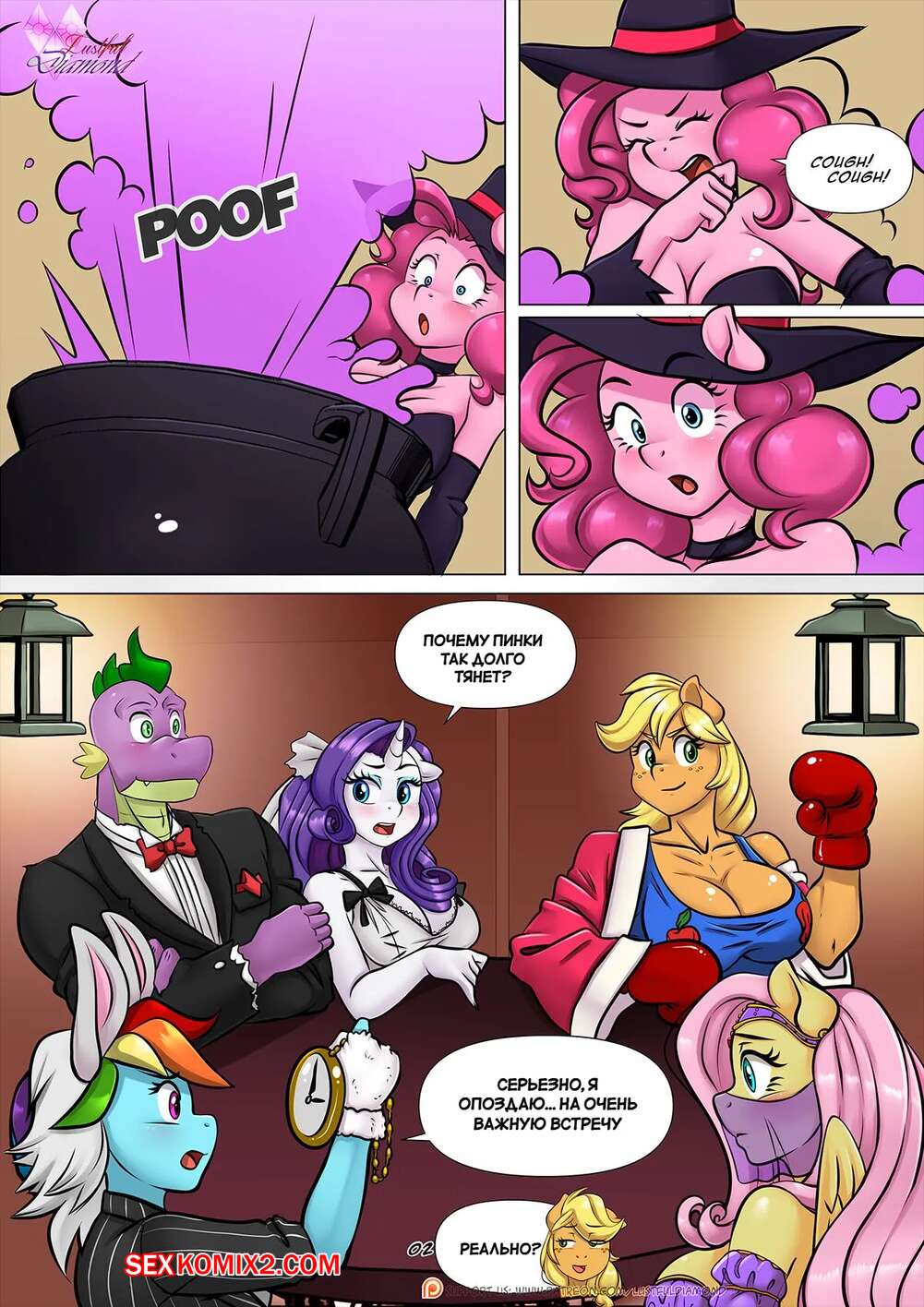 Порно комикс My Little Pony. Похотливый бриллиант. Ночь живого секса. Pia Sama. Парень проводил ночь со своими подругами и в итоге они все сильно возбудились. Девушки разделись и стали ласкать друг дружку, после чего они отсосали хуй парня и дали ему себя выебать.