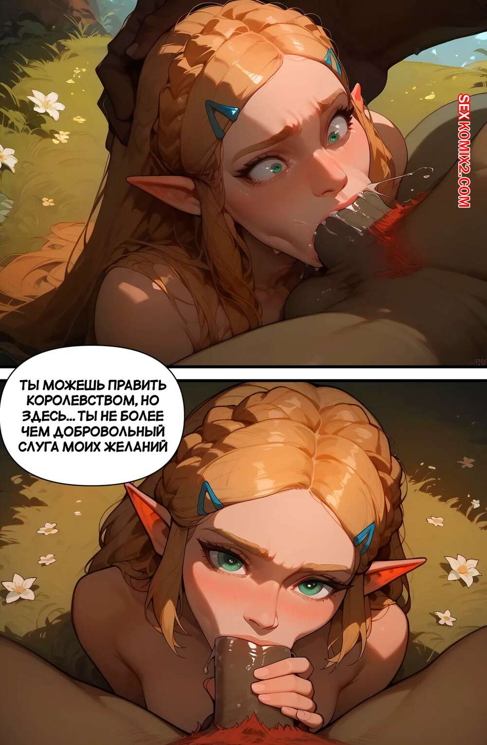 Порно комикс Legend Zelda. Сказки королевства. Tales Of The Kingdom. Scarlet Meow Темнокожий парень схватил сексуальную блондинку Зельду, желая повеселиться с девушкой. Он поставил ее на колени и дал отсосать свой большой хуй, после чего покрыл ее спермой.