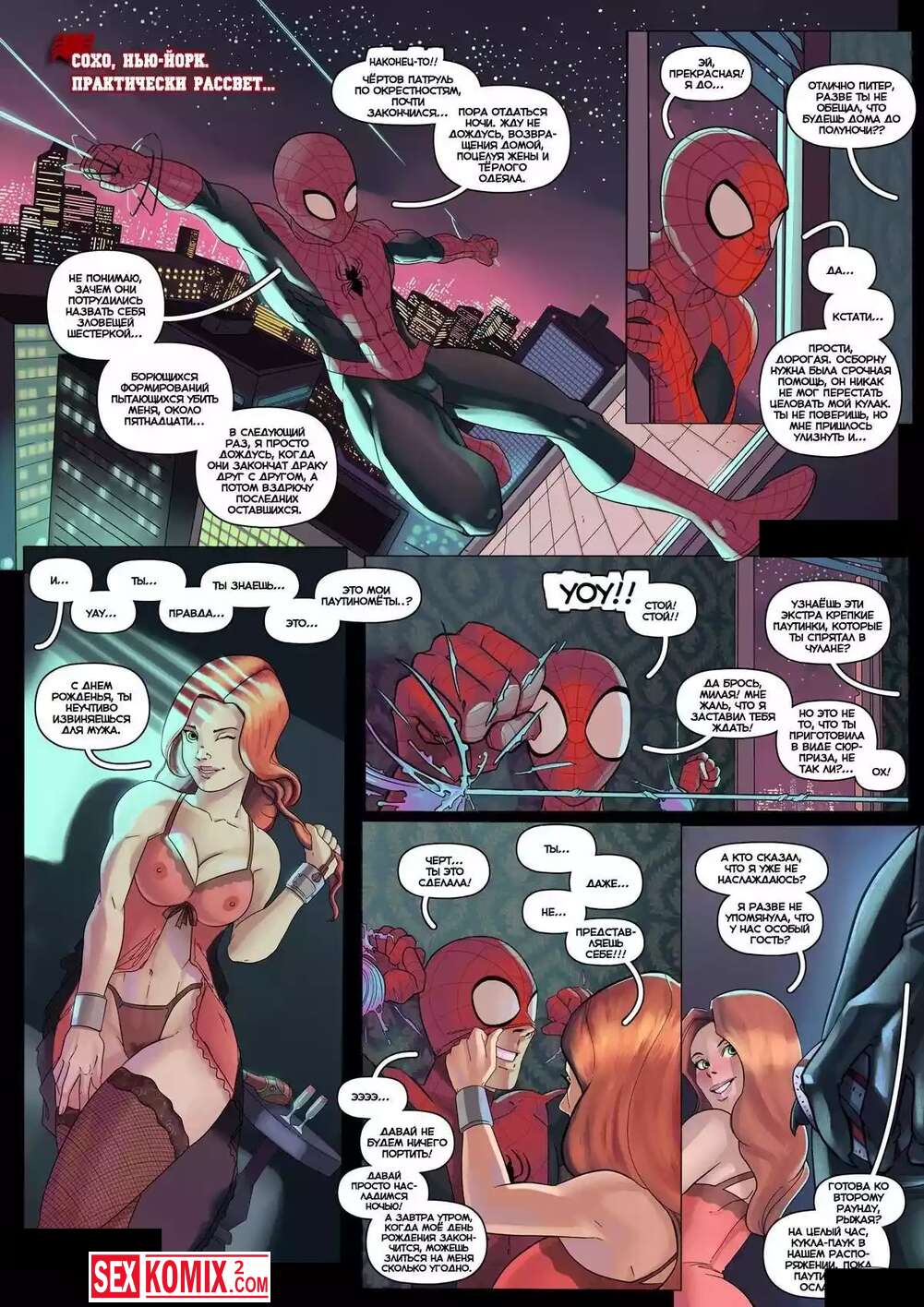Порно комикс Белокуро-рыжий подарок. Человек-паук. Питер очнулся привязанный к стене. Мери-джейн приготовила ему подарок. Она позвала ночную кошку что-бы устроить трийничок с ней.