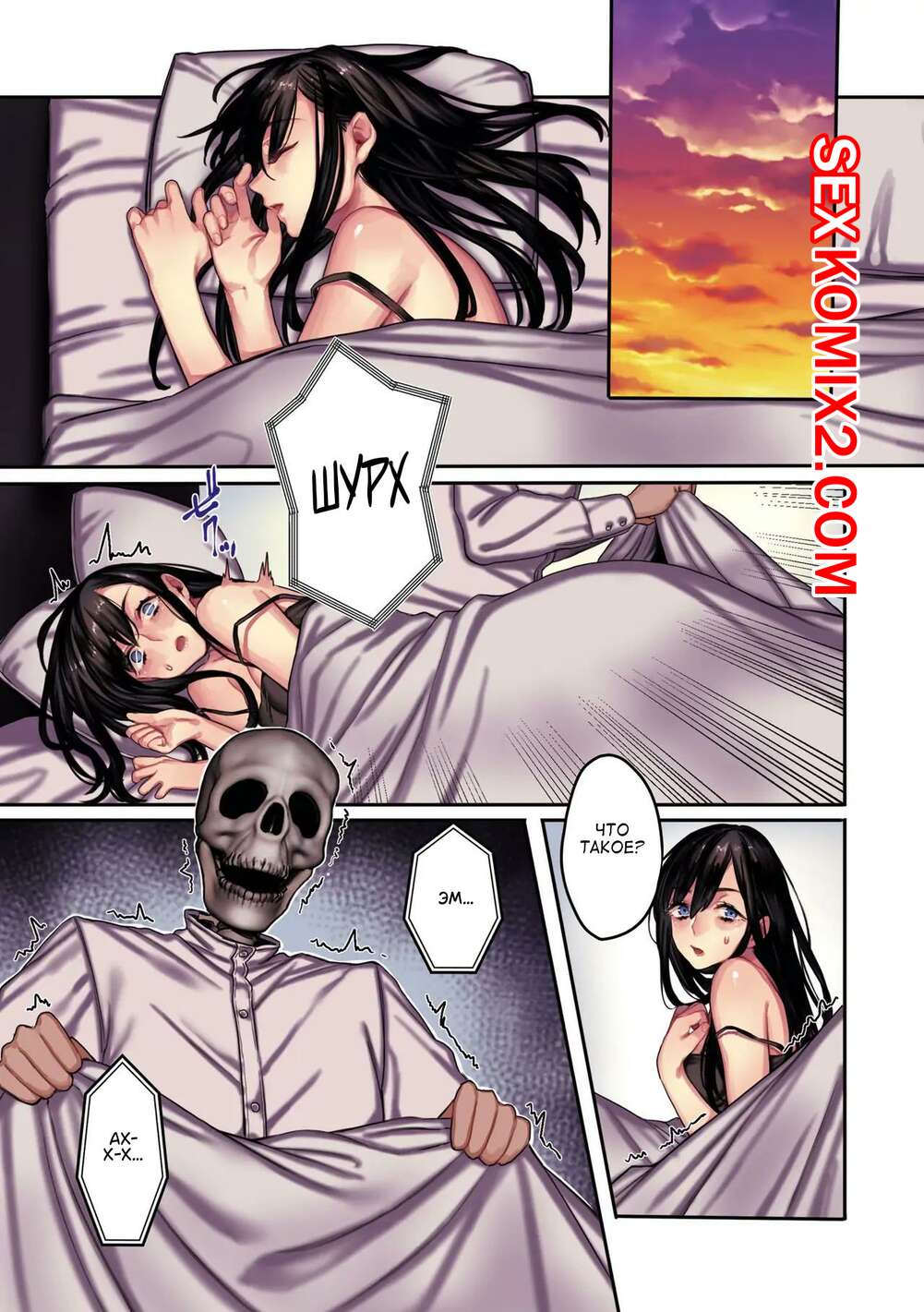 Порно комикс Привязанный к земле дух. Часть 2. Rororogi Mogera Горячая брюнетка была очень возбуждена и решила повеселиться со своим дружком с головой скелета. Она отсосала большой хуй парня, после чего дала выебать свою пизденку.
