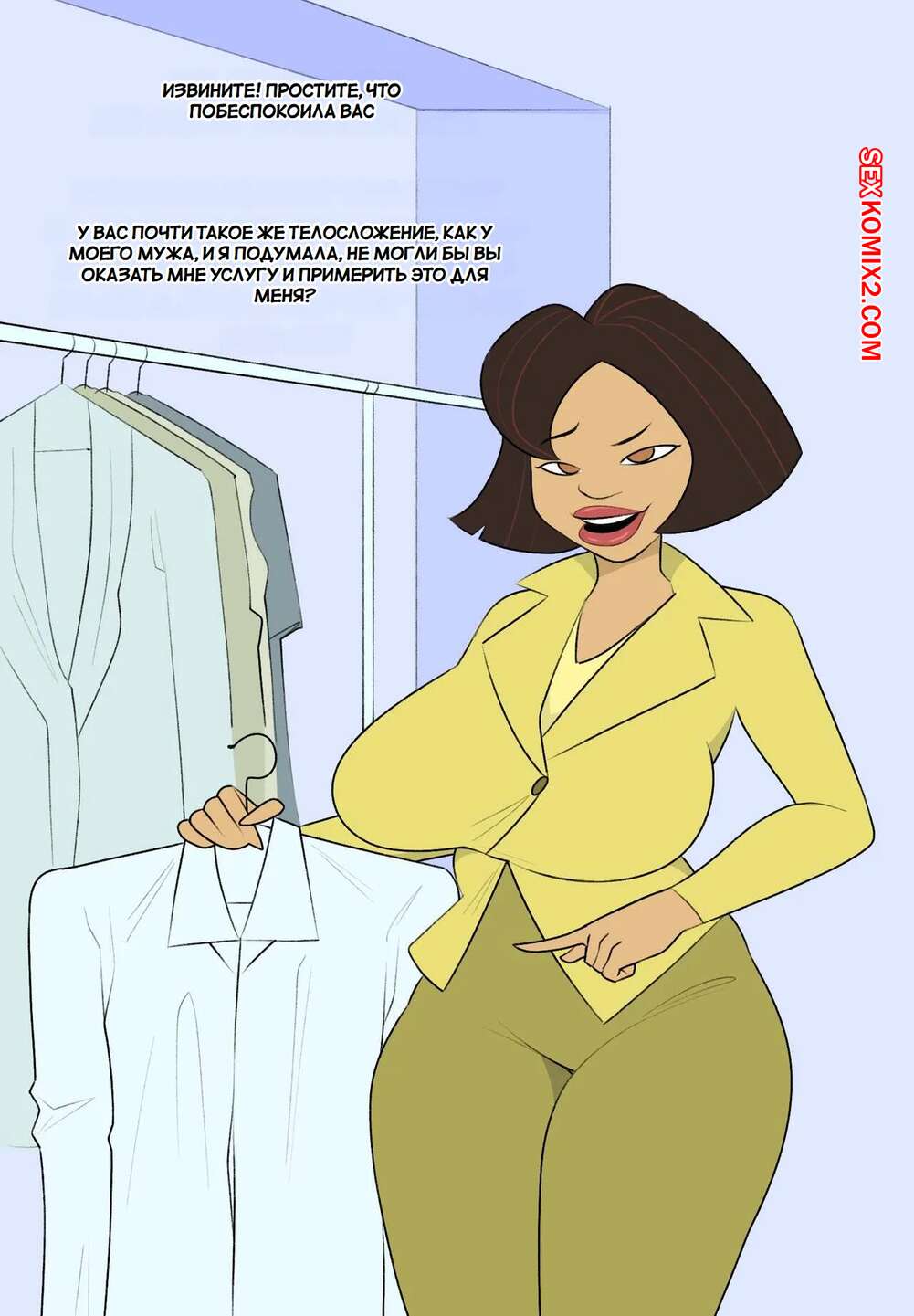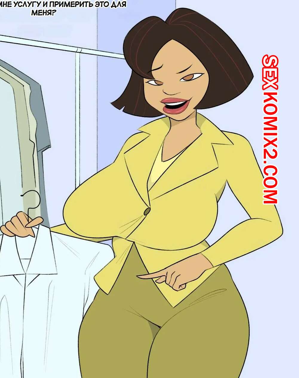 Порно комикс Труди Прауд НТР. Trudy Proud NTR. Jopuari Горячая милфа спалила стояк темнокожего парня в примерочной и очень возбудилась. Красотка встала на колени и отсосала большой хуй парня, после чего дала ему себя выебать и кончить в нее.