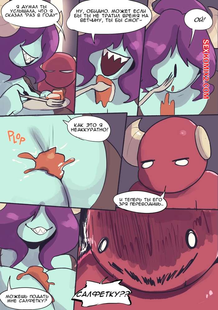 Порно комикс Демоны Денди. Просто десерт. Девушка с большими сиськами уронила в декольте сладкий пирог, она попросила салфетку у парня, но он решил все слизать своим языком.