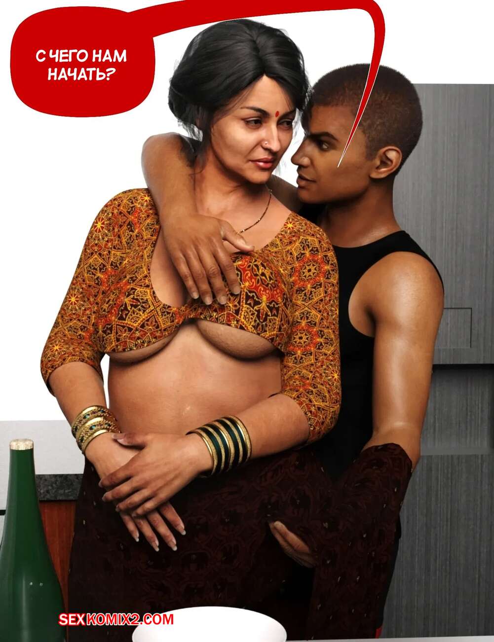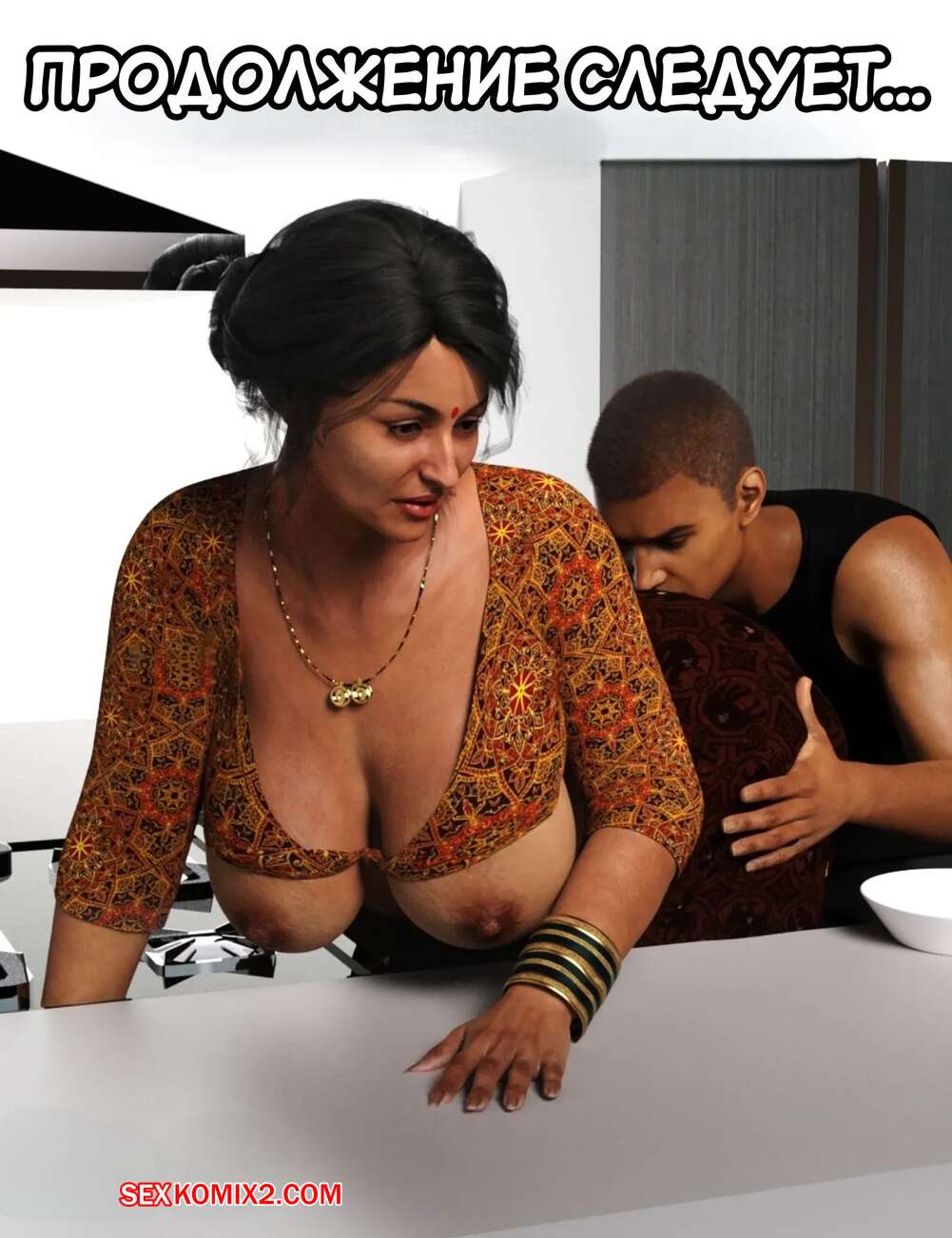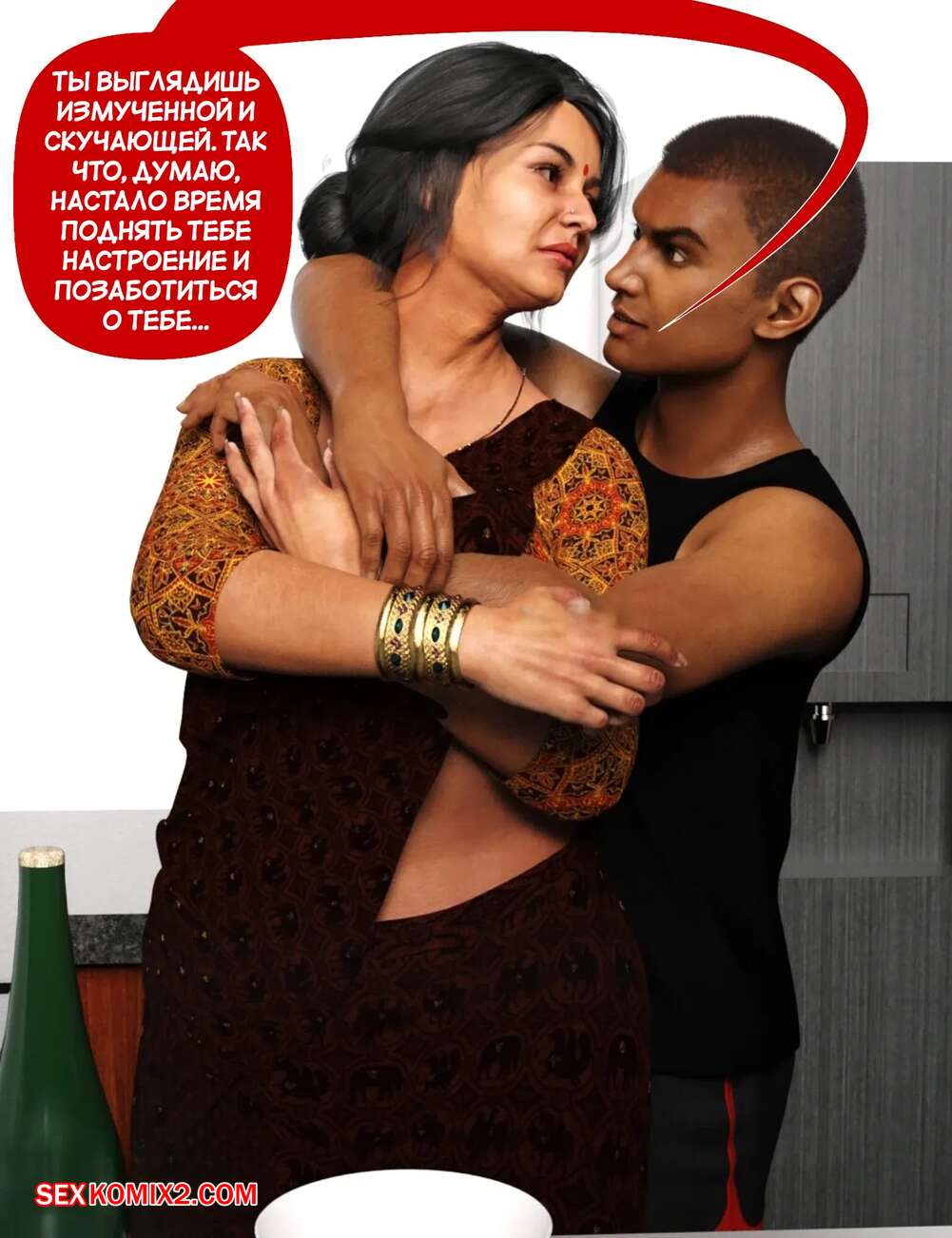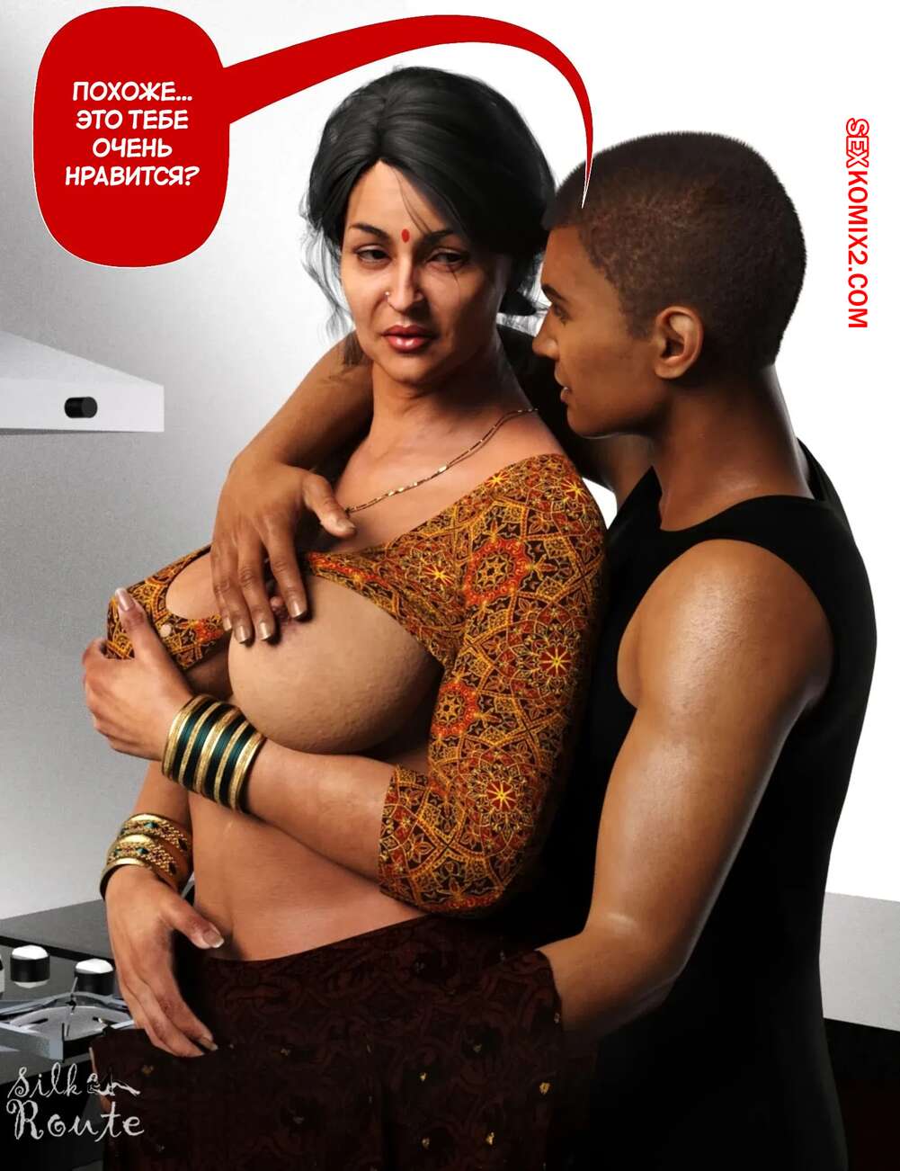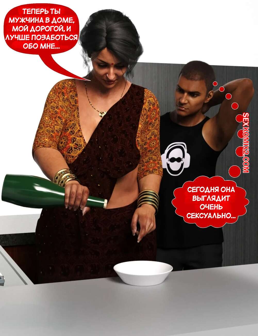 Порно комикс Мама и я. Часть 9. Mom and Me. Silk Route, Ira Raman Горячая милфа занималась делами по дому, пока ее муж просто сидел без дела. Сынок красотки подошел к ней сзади на кухне и стал ласкать мамочку, желая ее выебать.