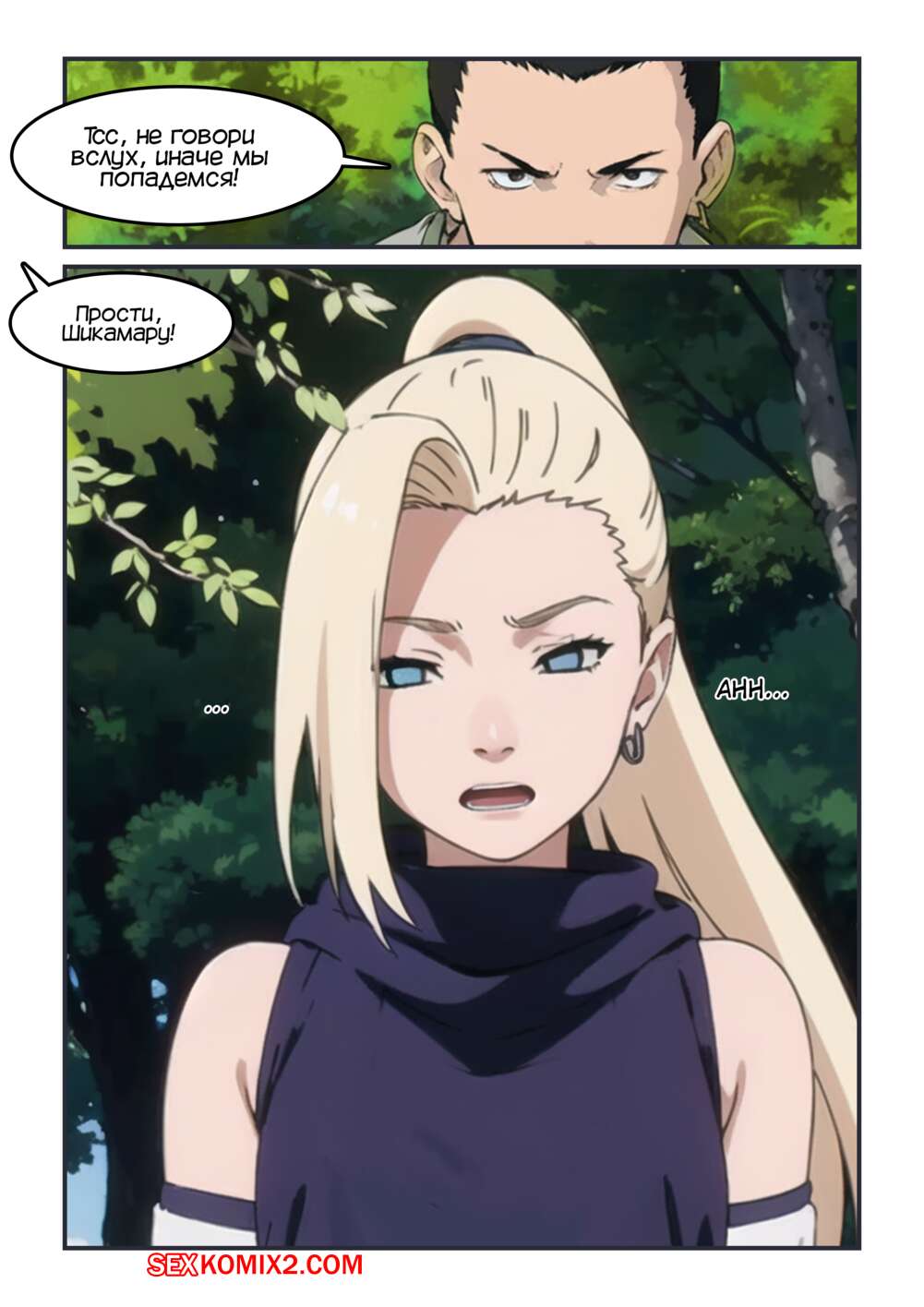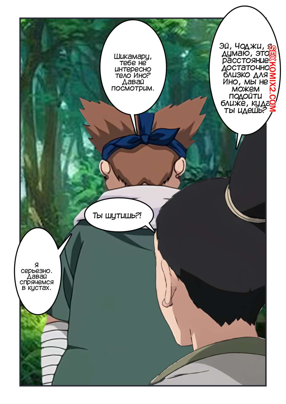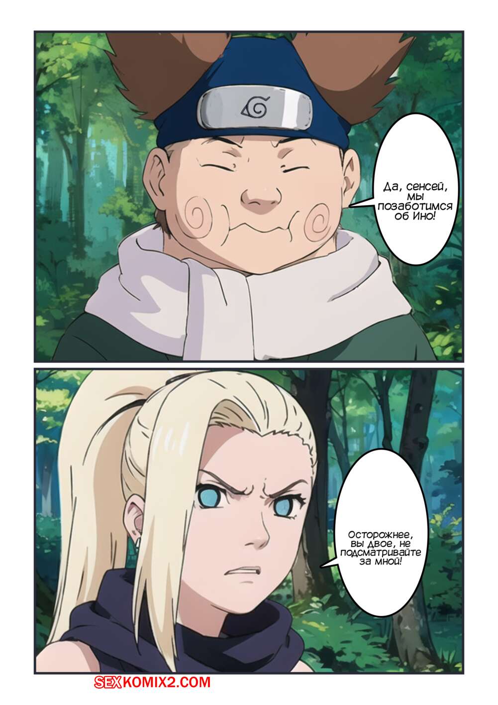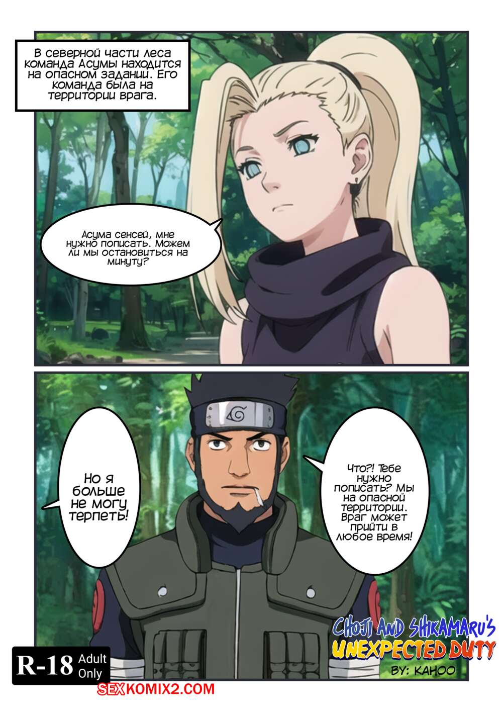 Порно комикс Наруто. Неожиданный долг Чоджи и Шикамару. Kahoo Во время опасной миссии Ино захотела в туалет, а Сенсей отправил Чоджи и Шикамару составить компанию девушке. Они спратялись в кустах и стали наблюдать как девушка писает, любуясь ее бритой киской.