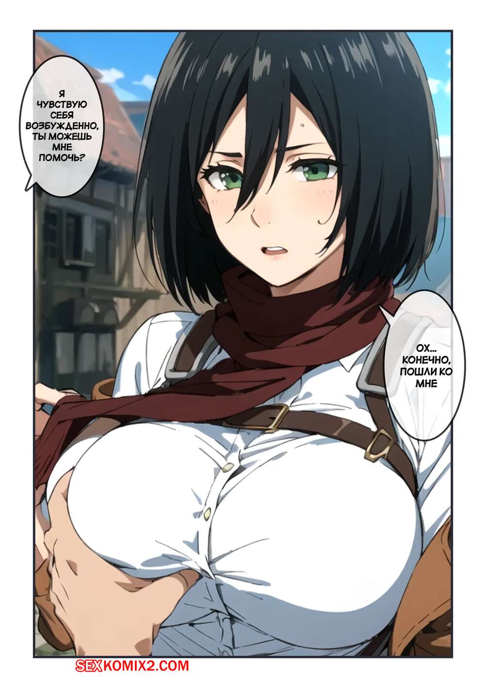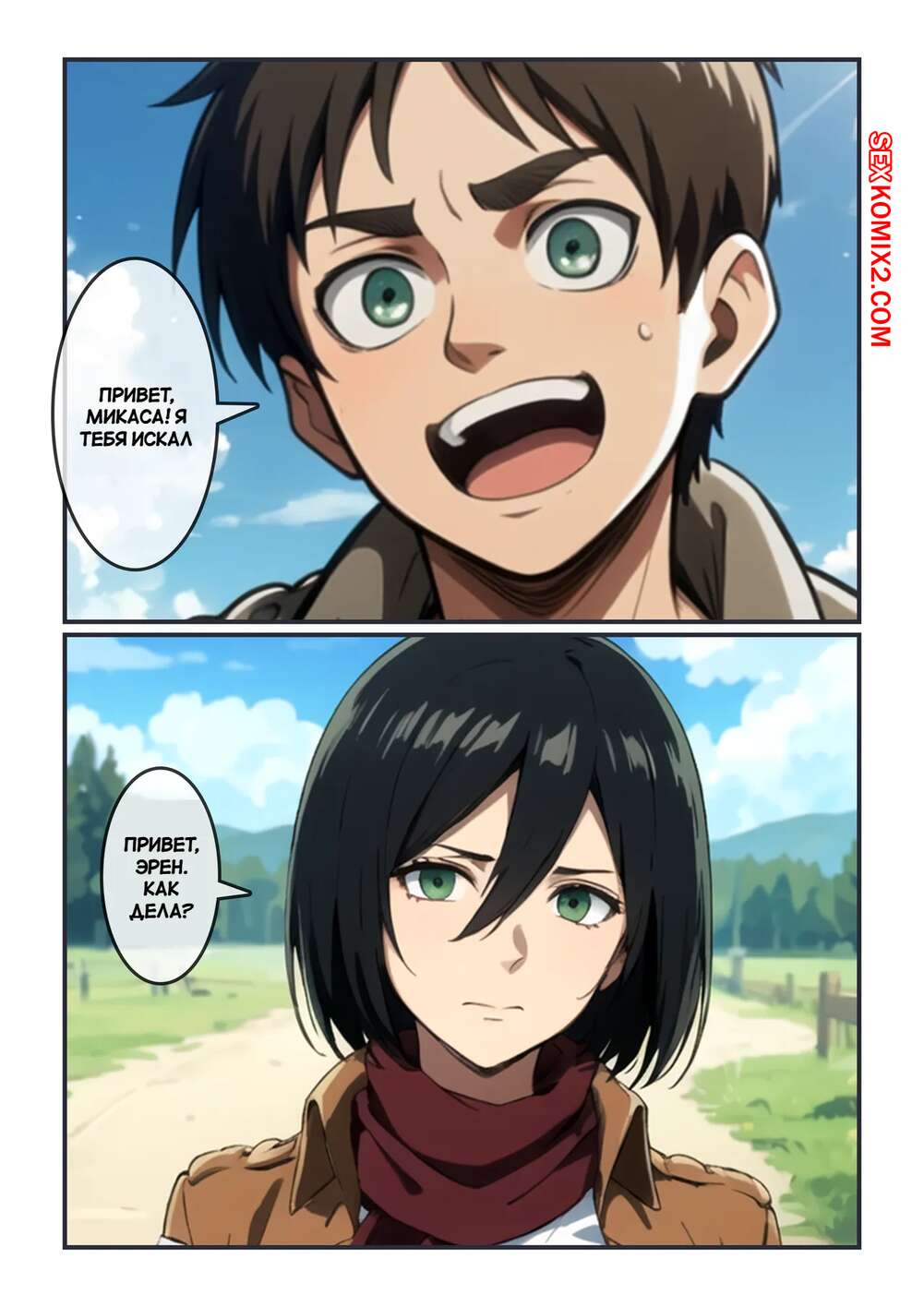 Порно комикс Атака титанов. Дневной секс с Микасой. Daytime sex with Mikasa. Kahoo Микаса и Эрен были очень возбуждены и решили повеселиться. Красотка разделась и отсосала большой хуй своего дружка, после чего дала ему выебать свою пизденку.