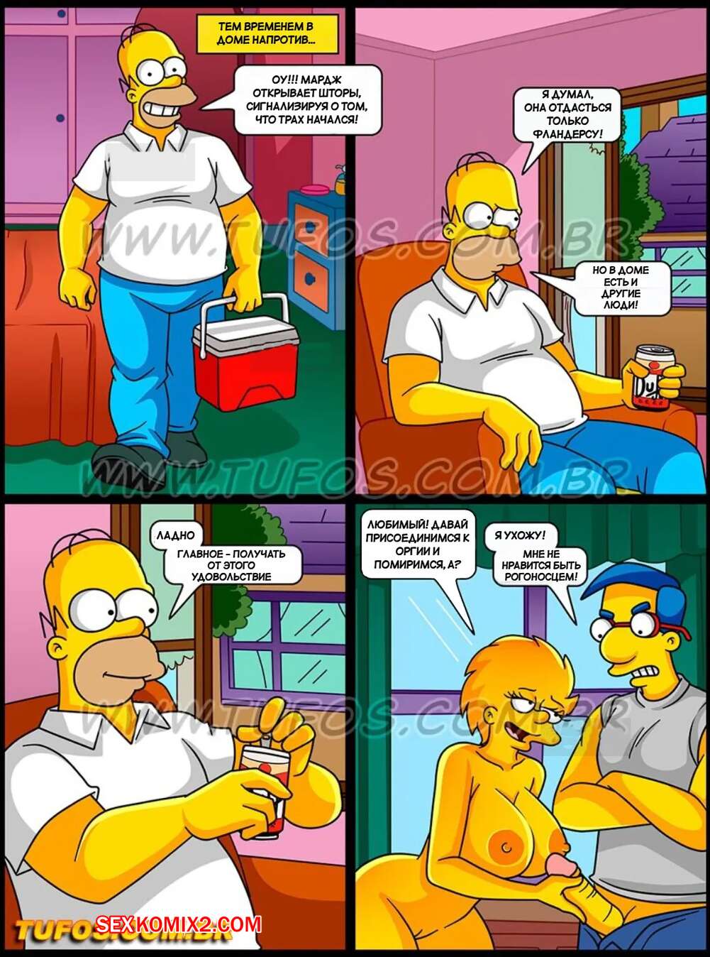 Порно комикс Симпсоны. Часть 69. Os Simptoons. Tufos Милхауз обнаружил как Фландерсы трахают Лизу и поспешил обратиться к Мардж. Вдвоем они отправились к соседям, где устроили невероятную оргию с двойным проникновением.