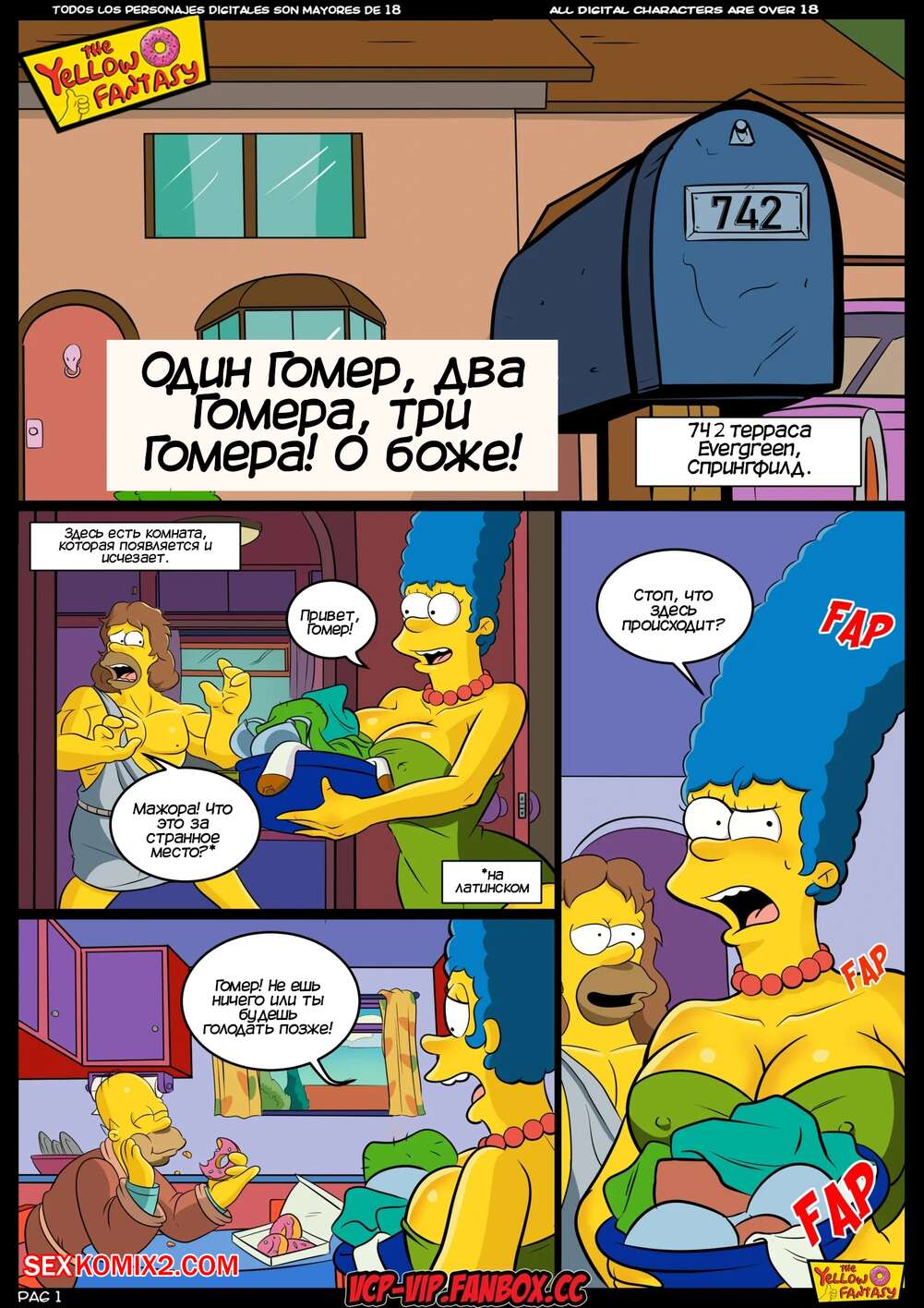 Порно комикс Симпсоны. Желтая фантазия. Часть 14. Диклегангеры. The Yellow Fantasy. Dicklegangers Загадочным образом в доме Мардж оказались сразу три Гомера. Красотке понравилась эта идея и она стала сосать хуи парней, после чего дала им себя выебать во все дырочки.
