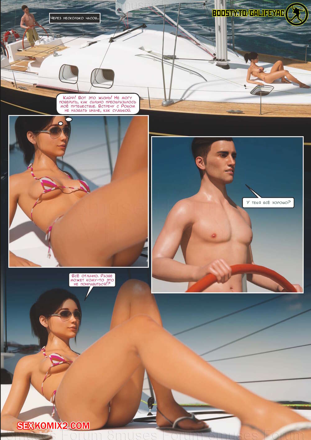 Порно комикс Подарок судьбы. Часть 1. The Bounty. Strutter79 Горячая брюнетка отправилась плавать на лодке с тремя парнями. Они решили воспользоваться моментом наедине с девушкой и стали ее ласкать, желая выебать красотку.