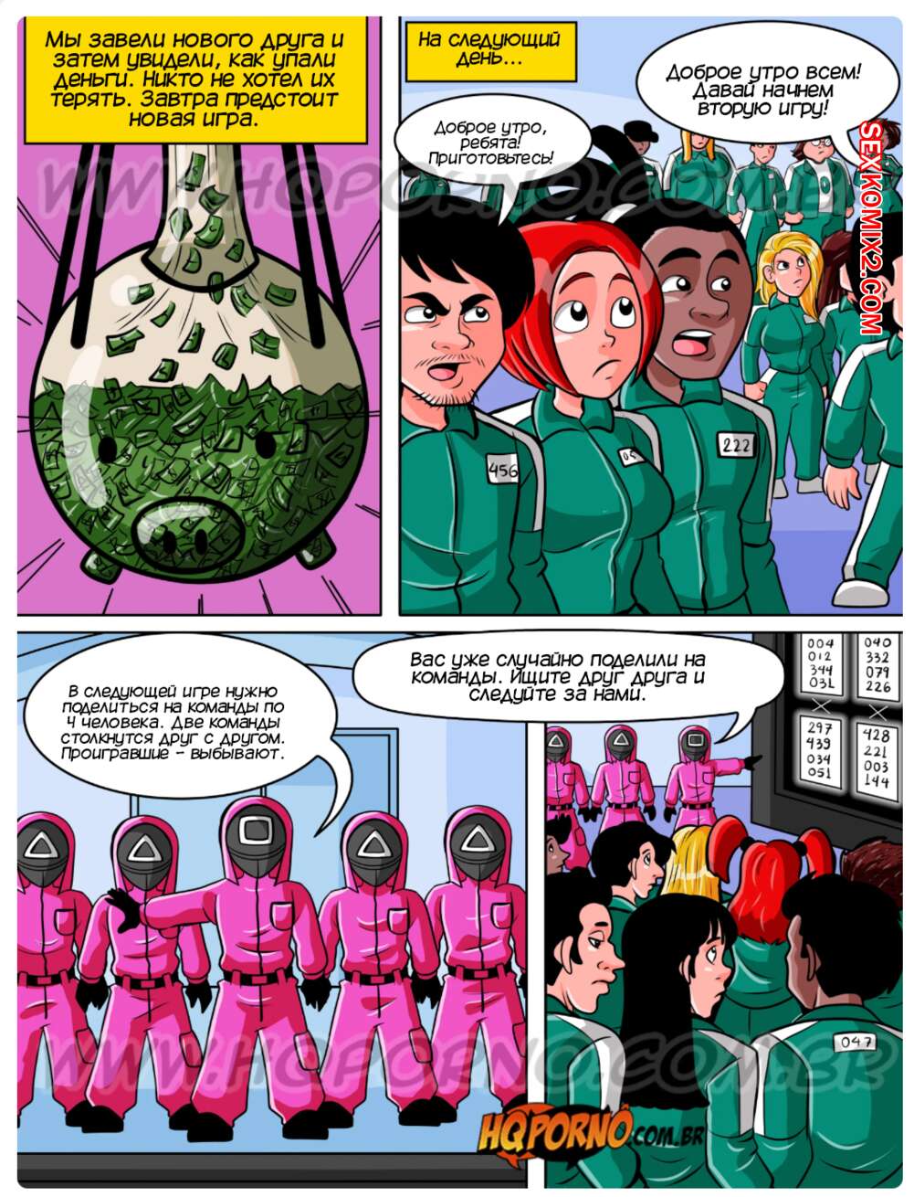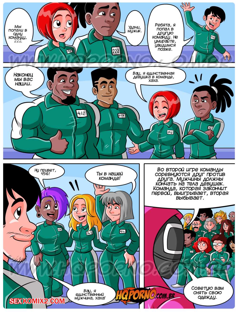 Порно комикс Секс раунд. Часть 2. HQPorno Участникам предстоит участие во второй игре. Они поделились на команды по 4 человека и теперь парням предстоит покрыть девушек своей спермой на скорость.
