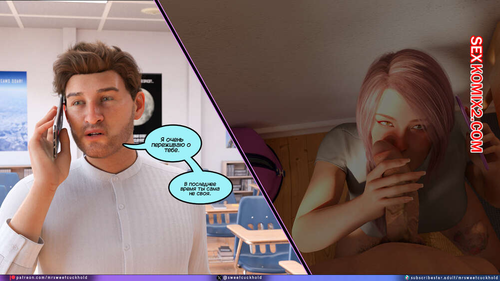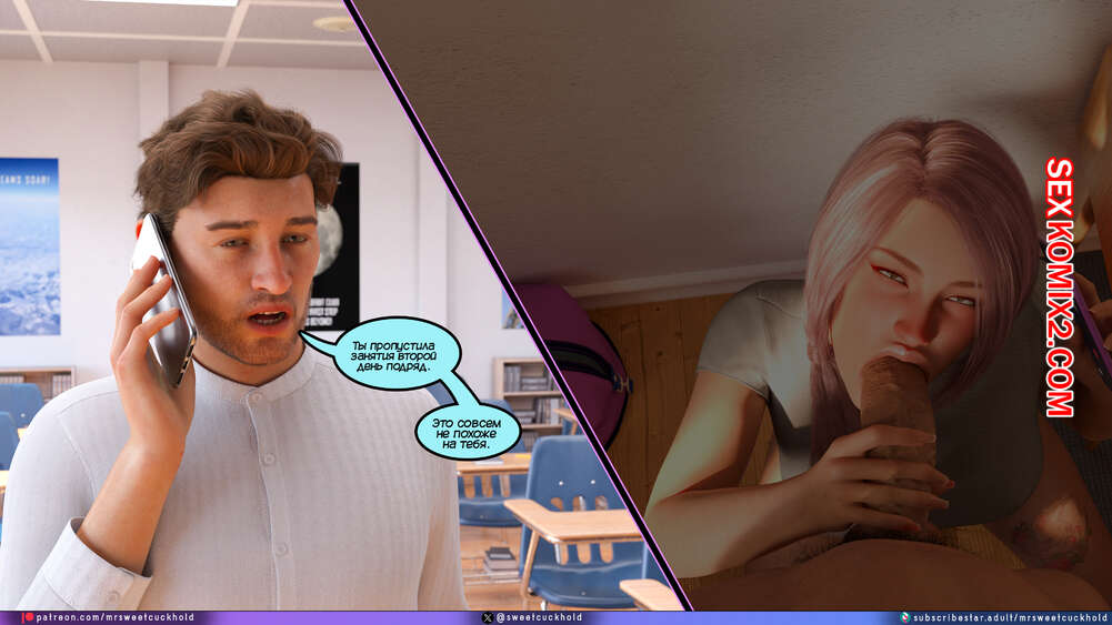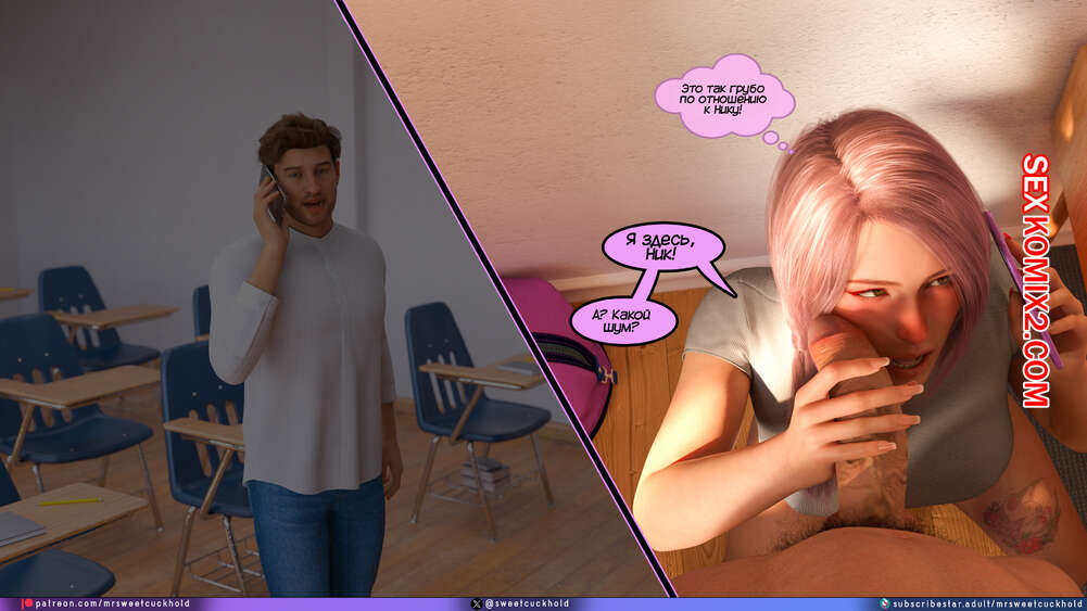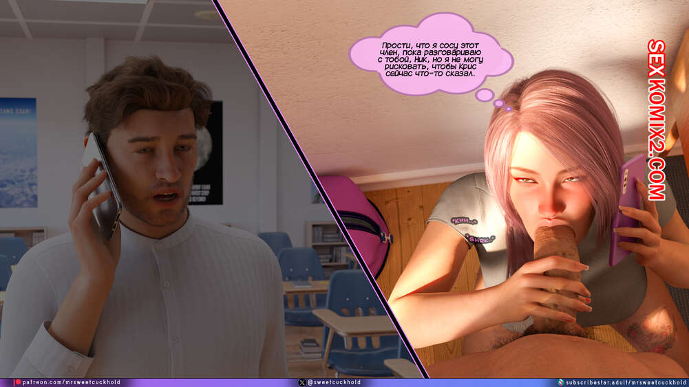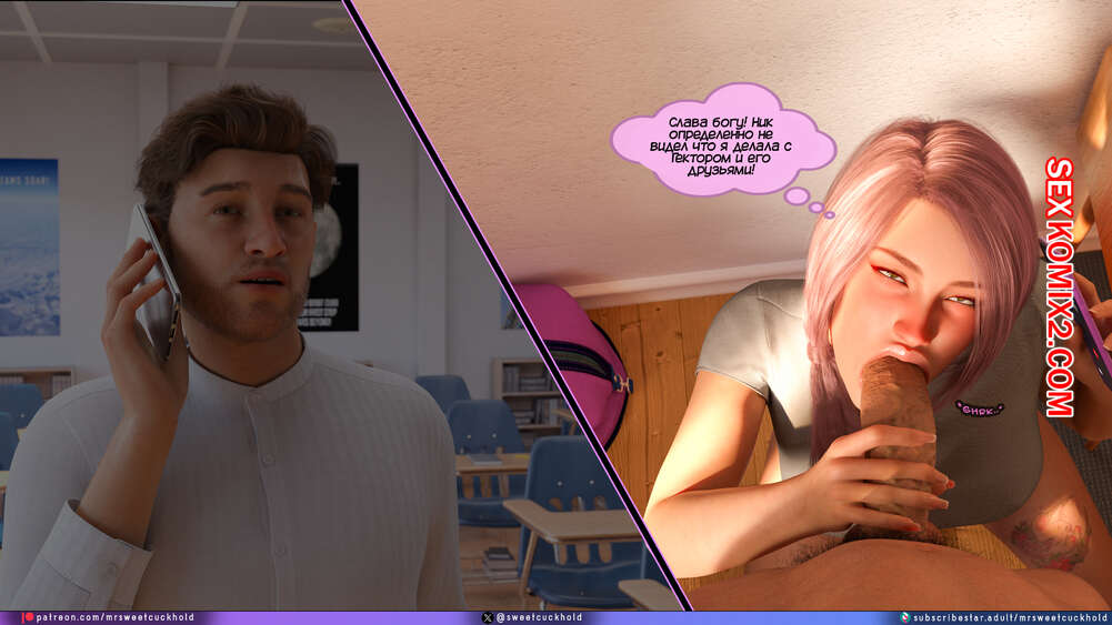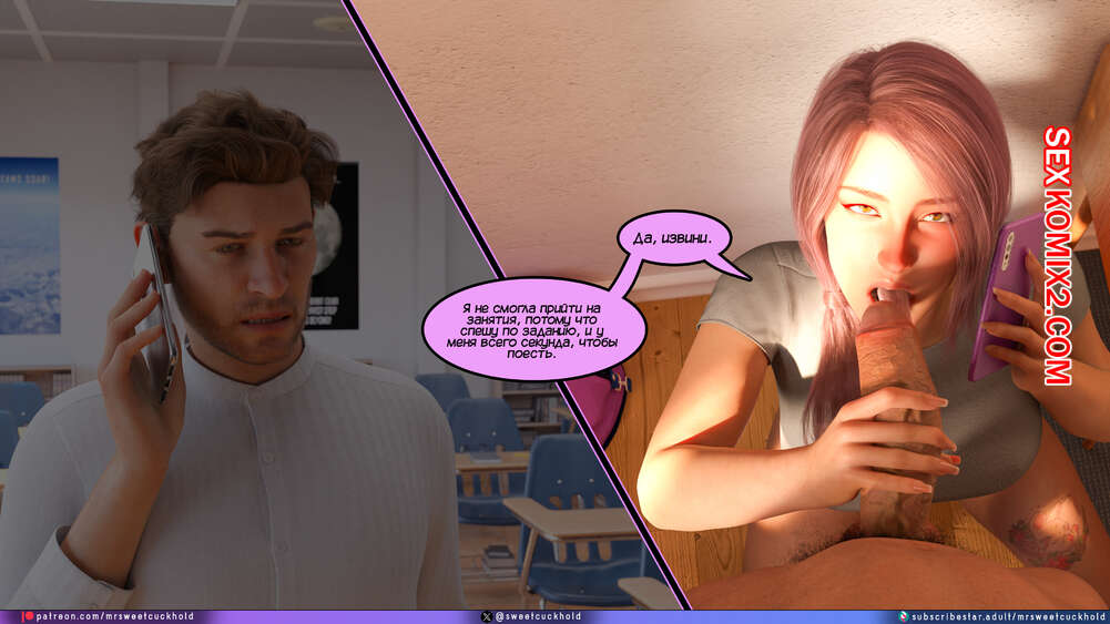 Порно комикс Тайное предательство. Часть 7. Undercover Betrayal. Mr.SweetCuckhold Эшли уже второй день подряд пропускает занятия, от чего Ник сильно переживает. Он звонит любимой, чтобы узнать что происходит, а она общается с ним, отсасывая член другого парня.