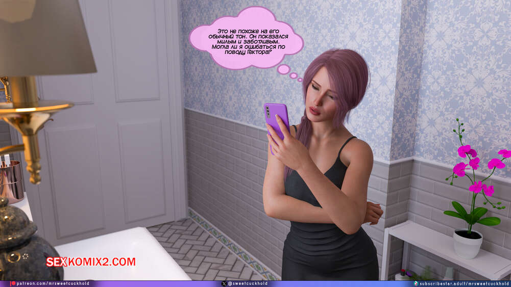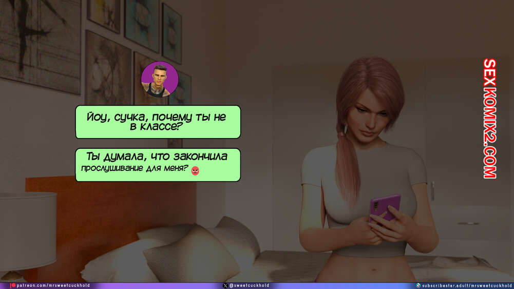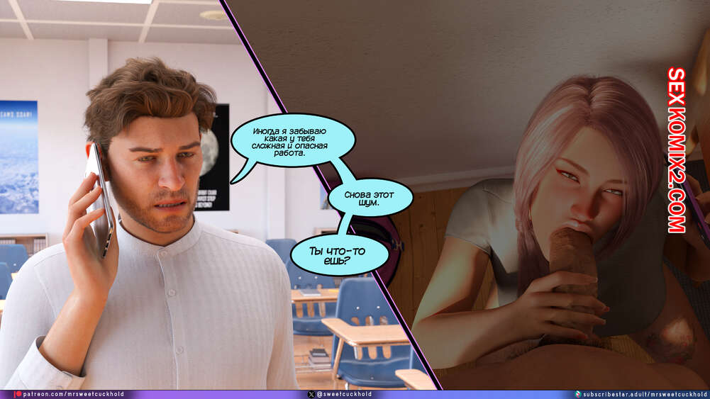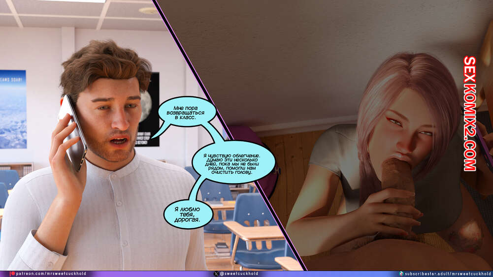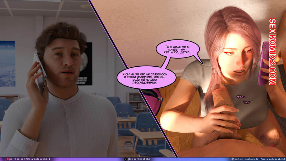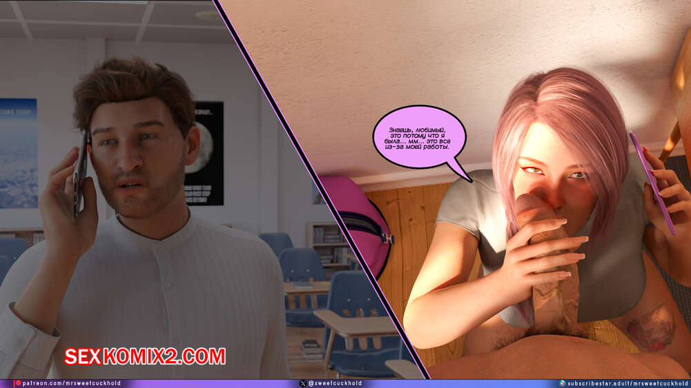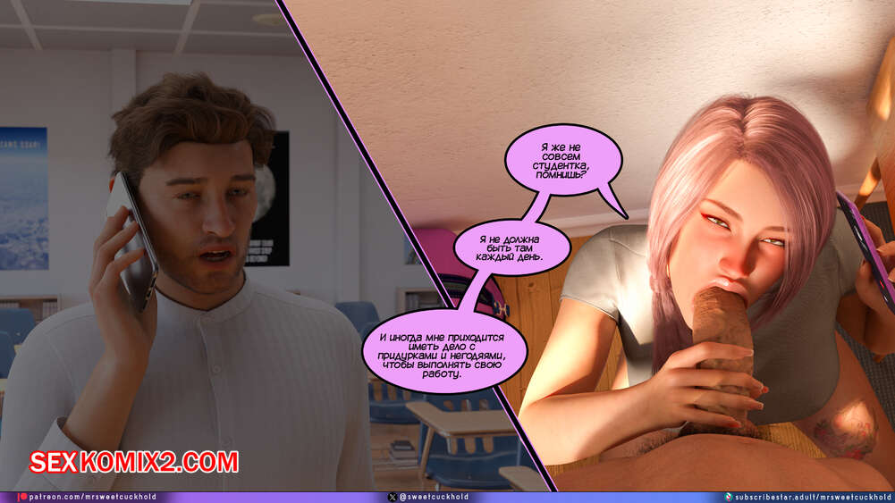 Порно комикс Тайное предательство. Часть 7. Undercover Betrayal. Mr.SweetCuckhold Эшли уже второй день подряд пропускает занятия, от чего Ник сильно переживает. Он звонит любимой, чтобы узнать что происходит, а она общается с ним, отсасывая член другого парня.