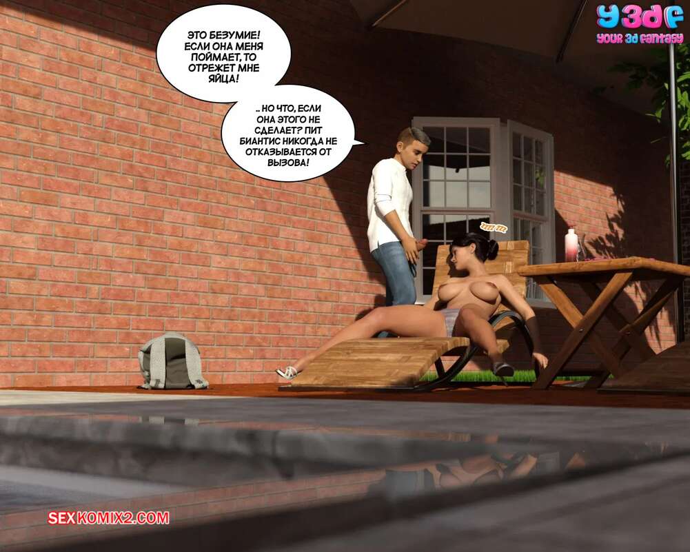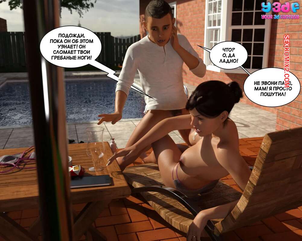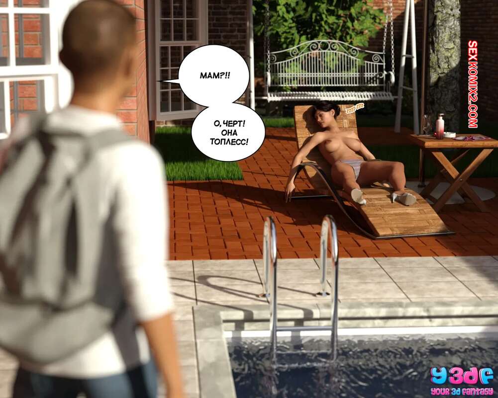 Порно комикс Загар. Часть 1. The Tan. Y3DF. После тяжелого дня горячая милфа решила расслабиться и позагорать у бассейна топлес. Красотка уснула, а ее сын решил воспользоваться моментом, чтобы потрогать большие сиськи мамочки и трахнуть ее ротик.