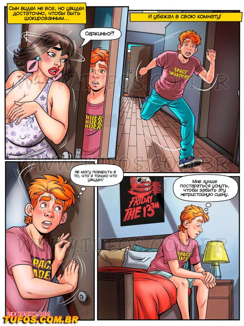 Порно комикс Донья Мама. Часть 6. Dona Mama a maezona da galera. Tufos Дона Мама взяла Мартину и отправилась с ней в комнату Сержиньо. Красотки разделись и соблазнили паренька своими шикарными телами, после чего дали ему себя выебать и кончить им на лицо.