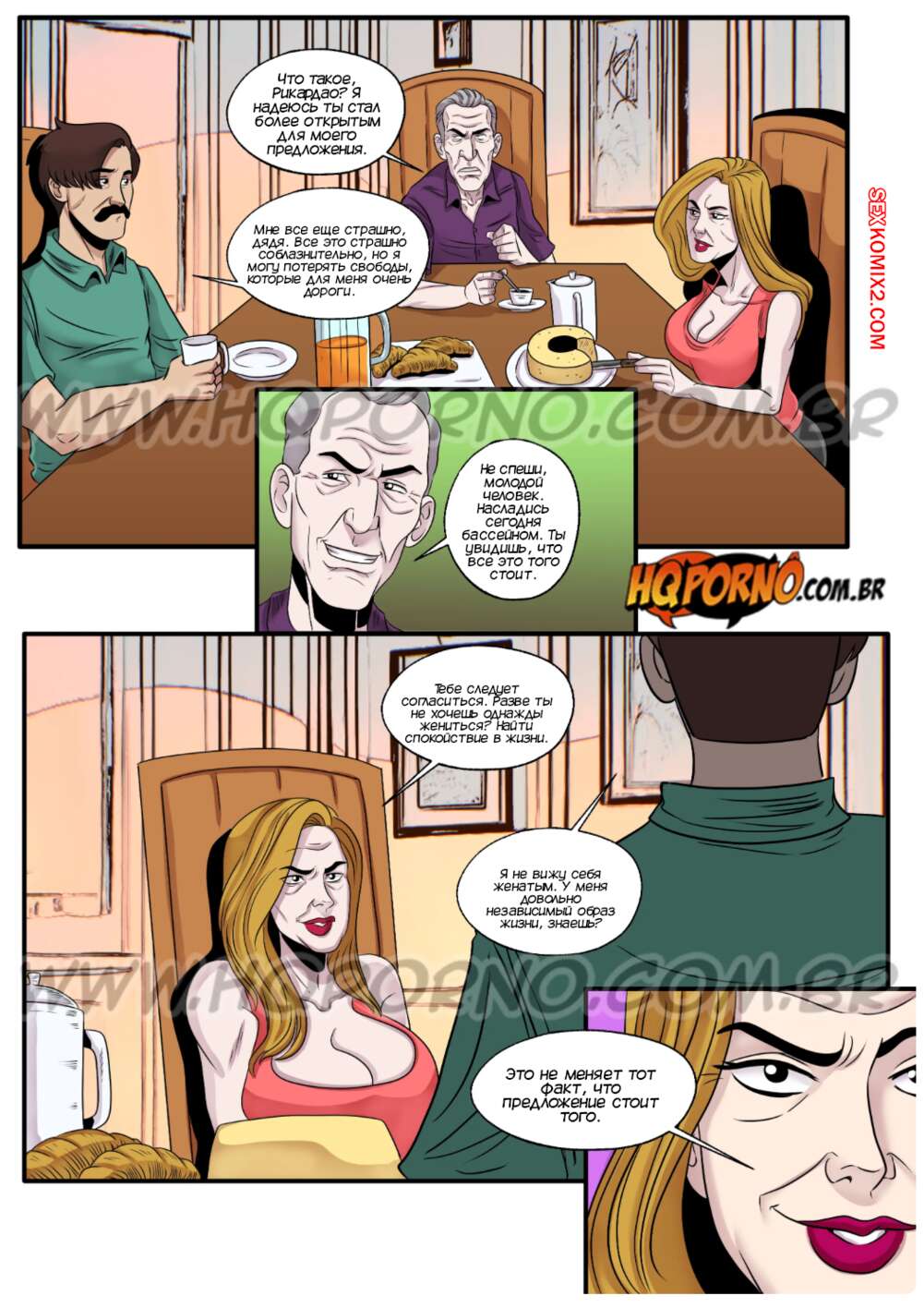 Порно комикс Рикардао Таларико. Часть 5. HQPorno Тетя Фатима продолжает добиваться того, что Рикардао согласился на предложение своего дяди. Милфа позвала свою племянницу и устроила групповую еблю с парнем, чтобы удовлетворить его.