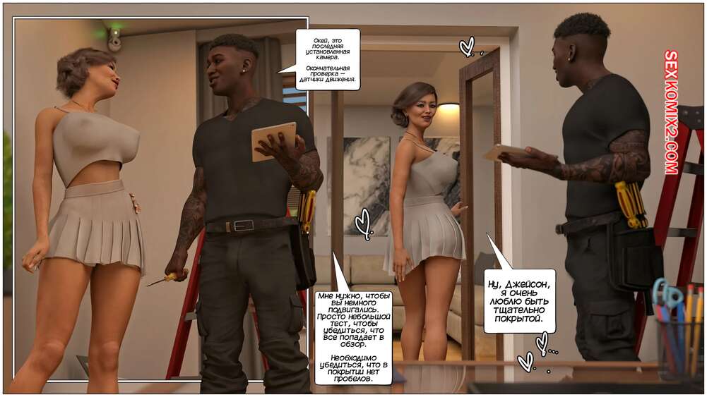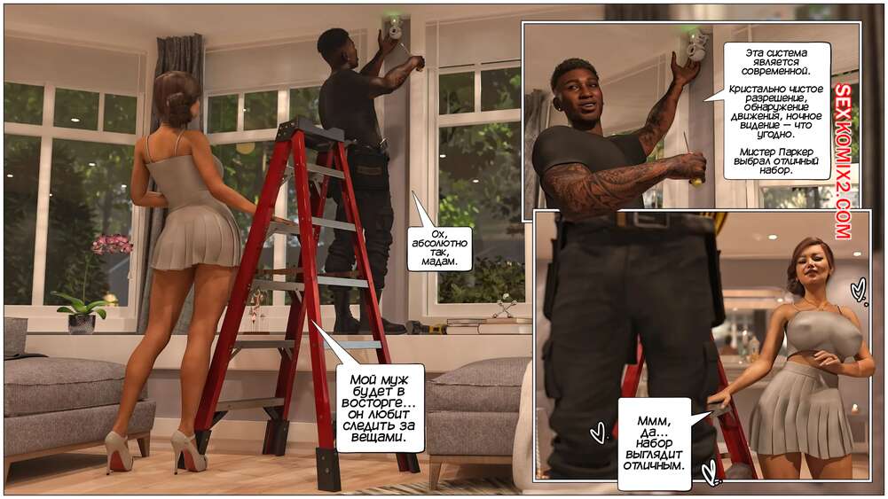 Порно комикс Бдительные сборы. Watchful Dues. Tab109 Темнокожий парень пришел домой к горячей милфе с шикарным телом, чтобы установить камеры слежения. Красотка стала соблазнять паренька и звать его в спальню, чтобы он ее хорошенько выебал.