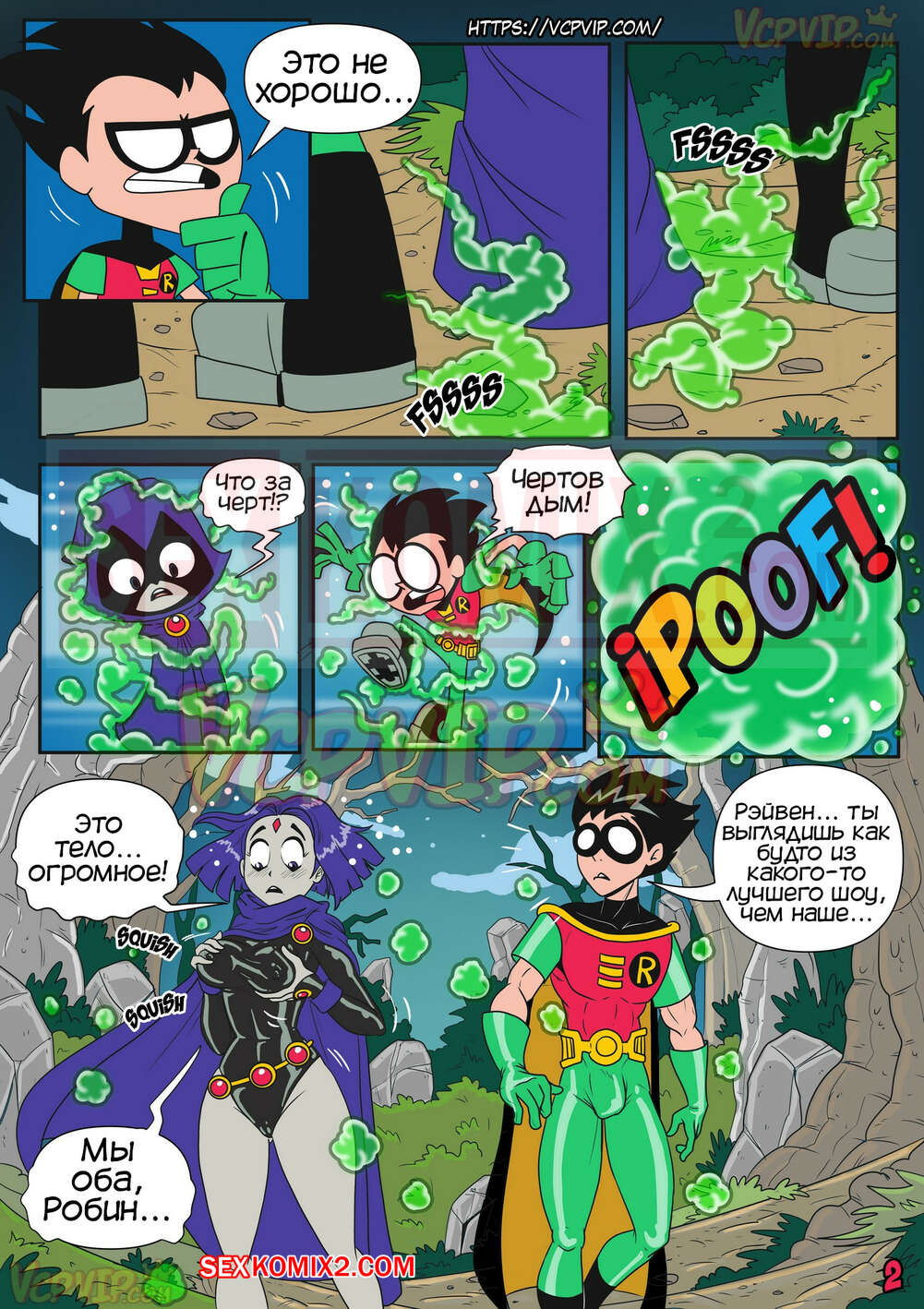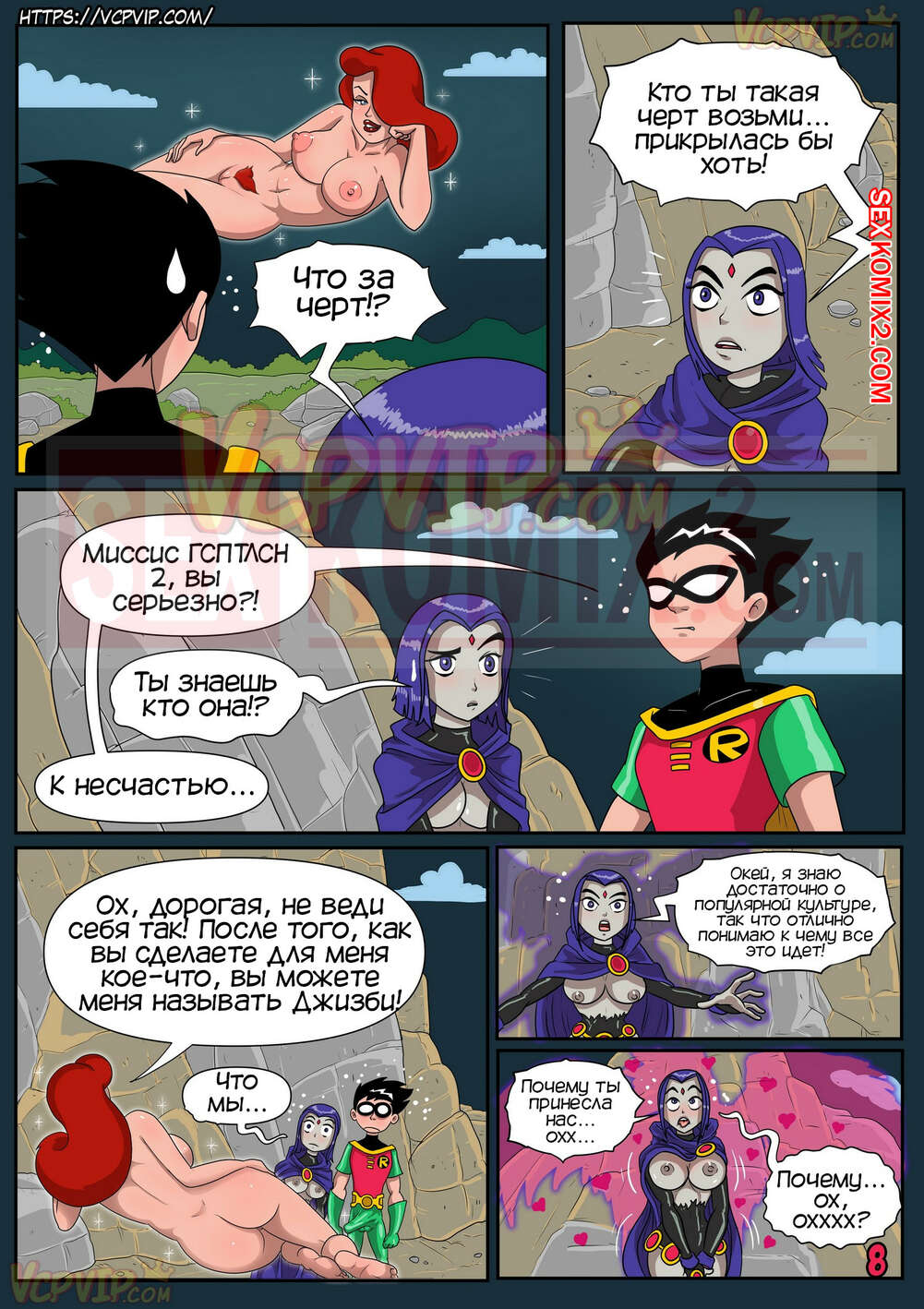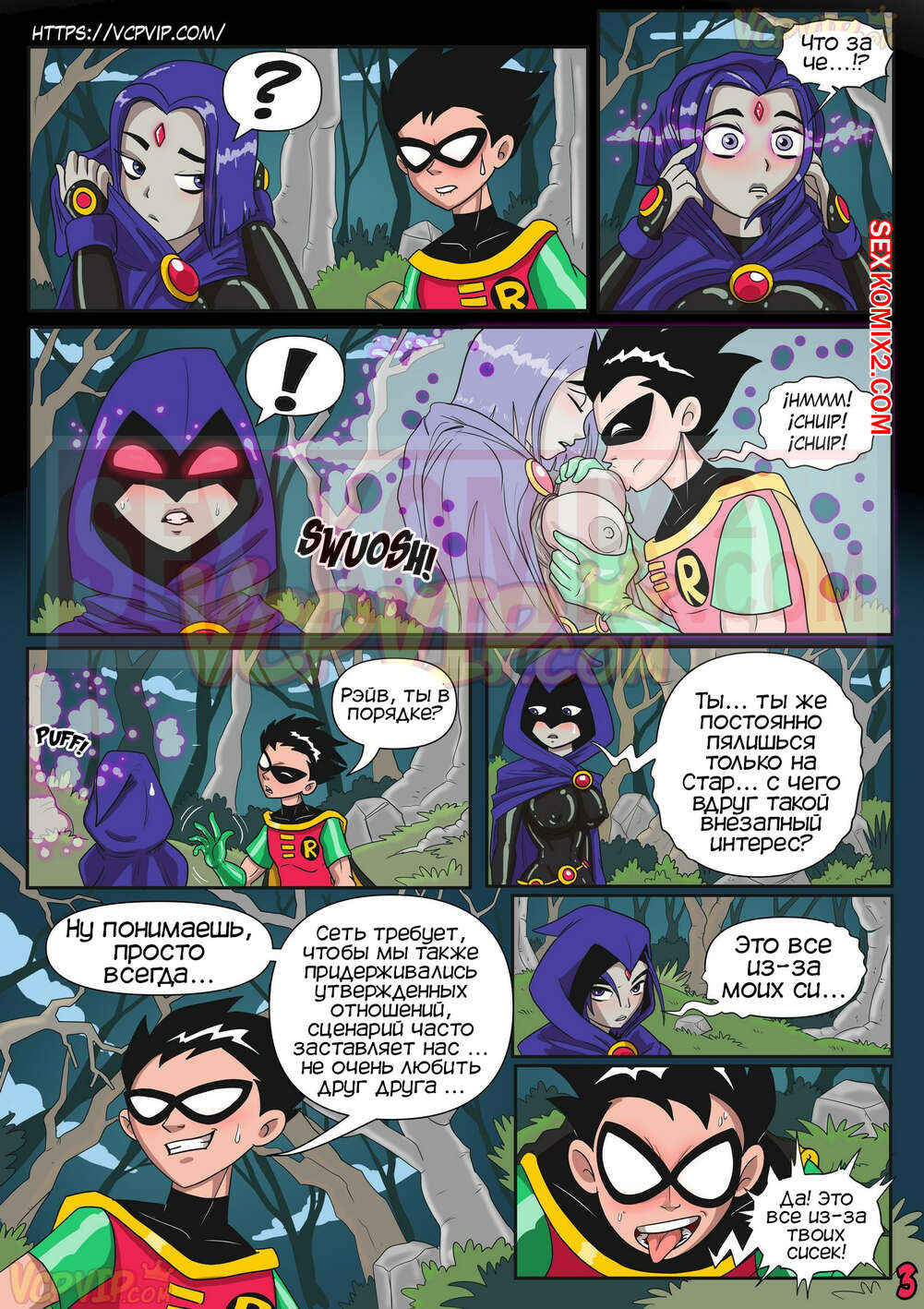 Порно комикс Юные Титаны. В затруднительном положении. Macergo. Рейвен и Робин переместились в другую реальность, их тела стали больше и сексуальней. Робин возбудился от больших сисек девушки и захотел трахаться.