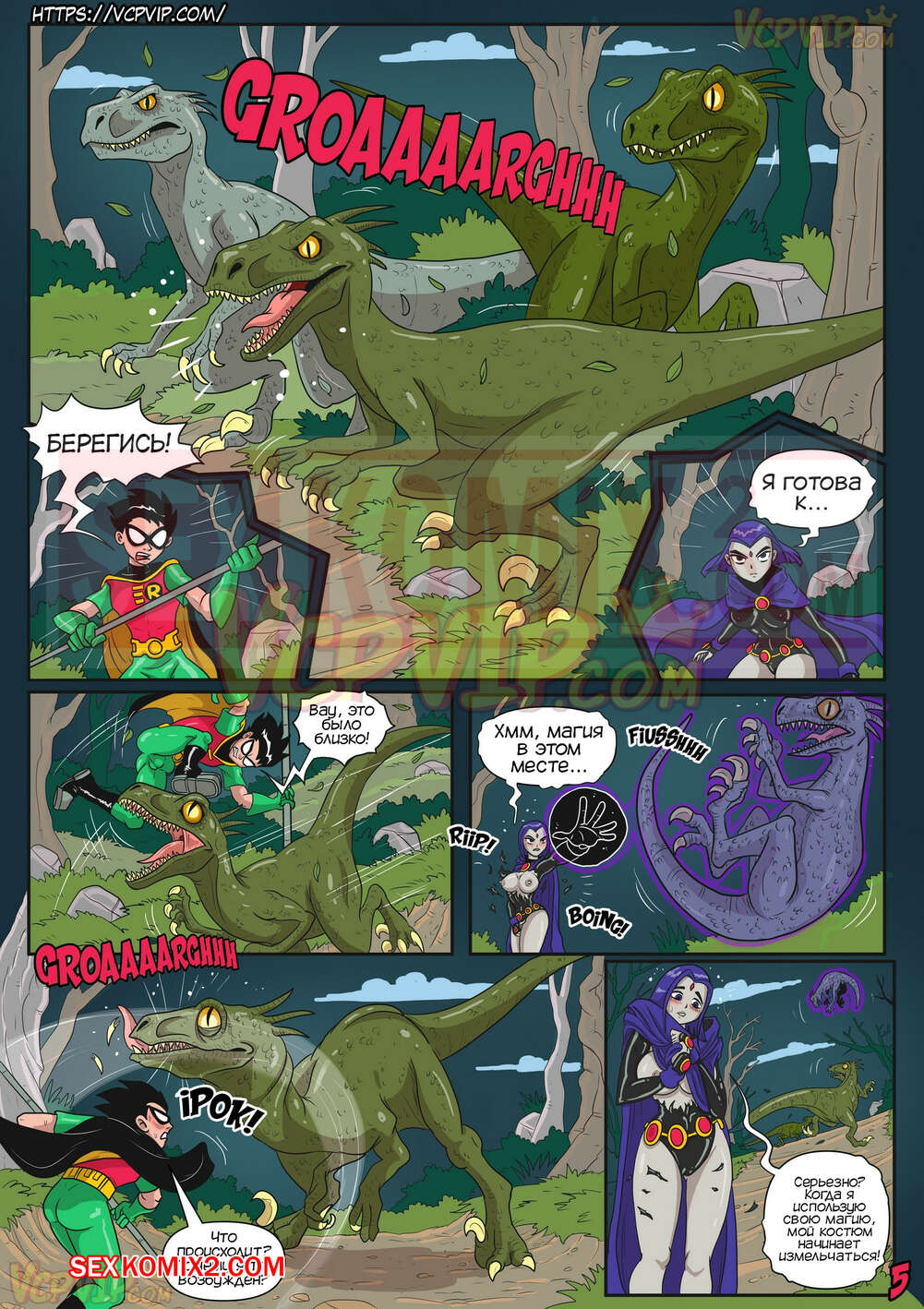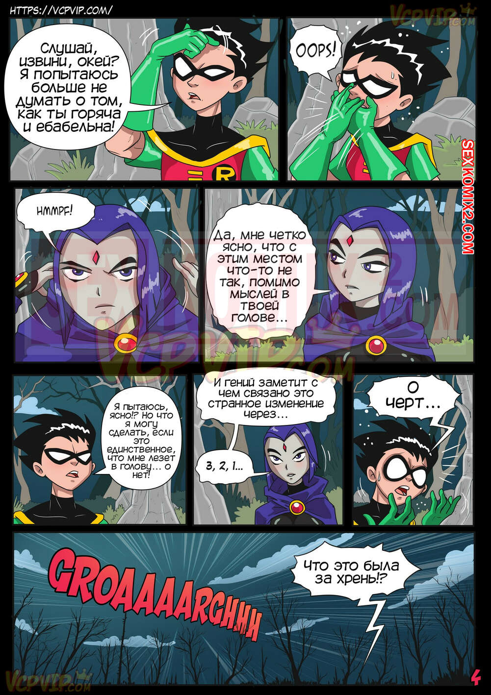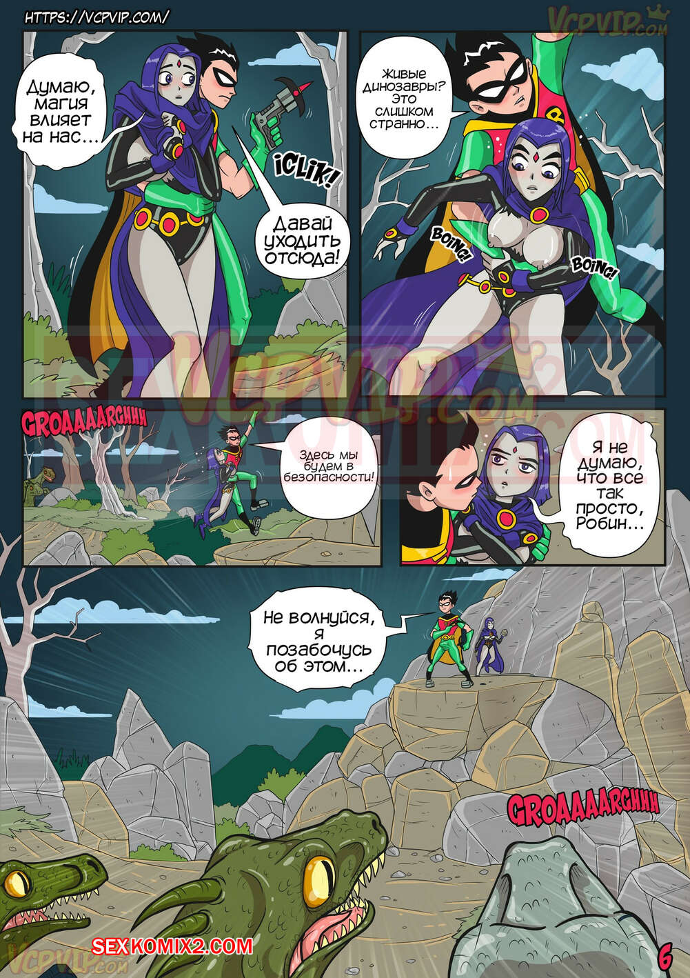 Порно комикс Юные Титаны. В затруднительном положении. Macergo. Рейвен и Робин переместились в другую реальность, их тела стали больше и сексуальней. Робин возбудился от больших сисек девушки и захотел трахаться.
