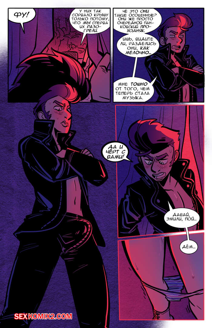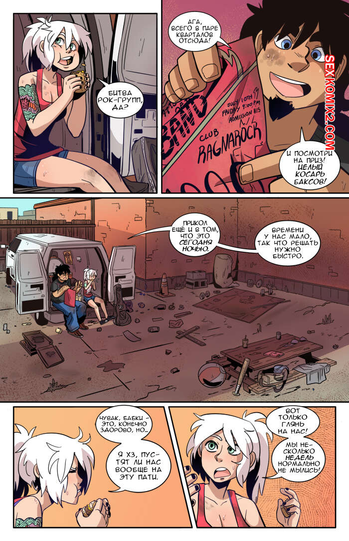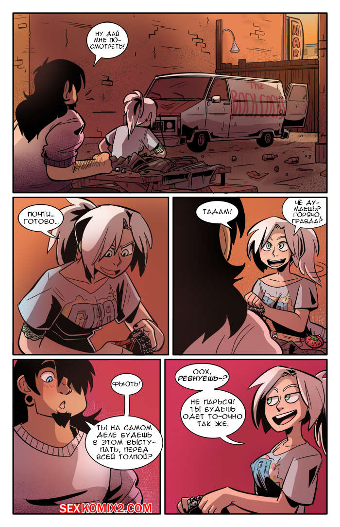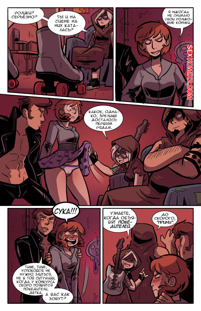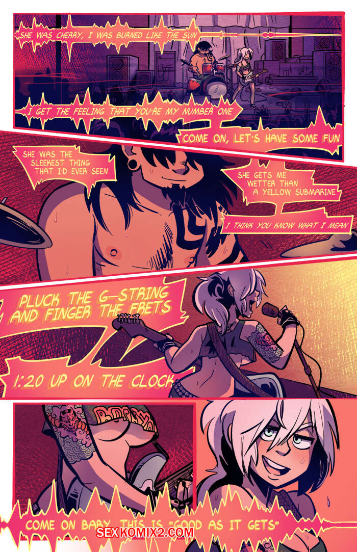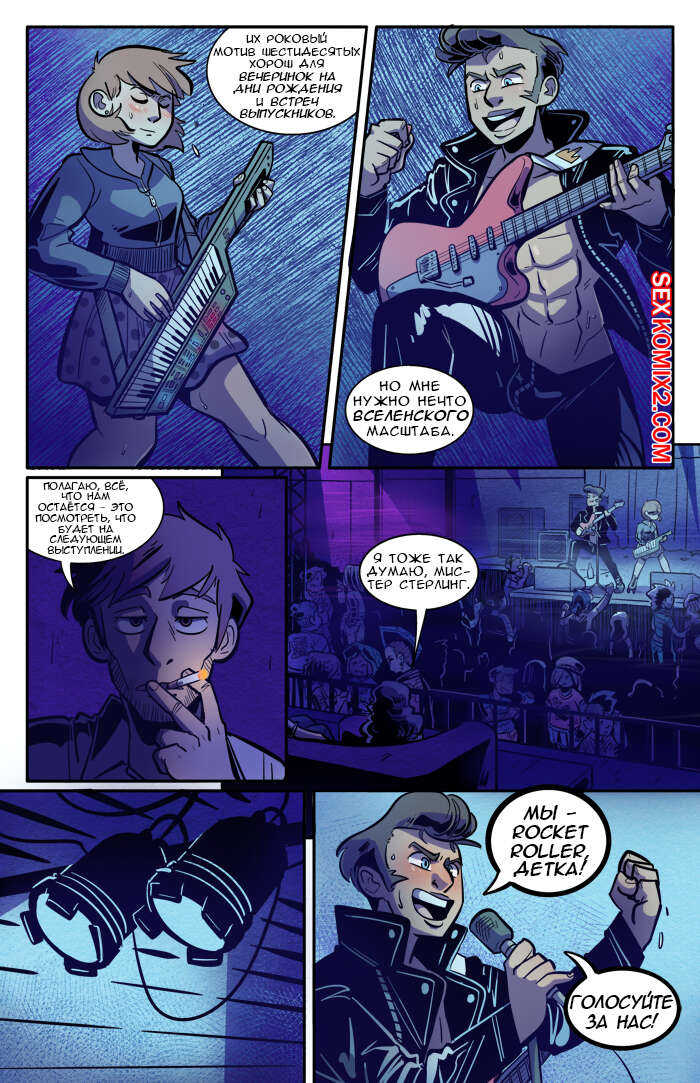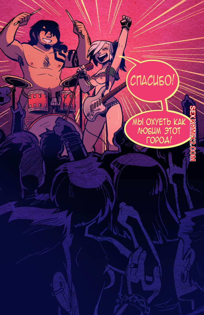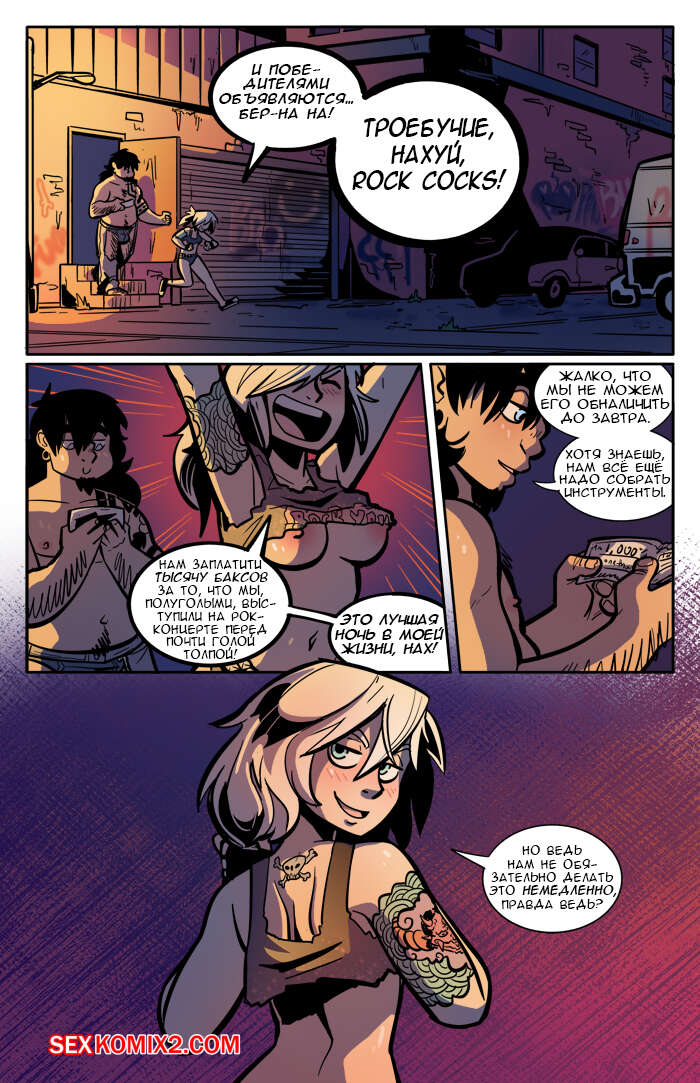 Порно комикс Рок хуй. The Rock Cocks. Часть 2. Вдарим рок Бездомные парень с девушкой решили выступить на рокконцерте, чтобы выиграть тысячу баксов. Они так волновались, что решили подрочить и расслабиться перед важным мероприятием. Успешно выступив и выиграв в конкурсе, они решили отпраздновать и поебаться в фургоне, но неожиданно их прервали.