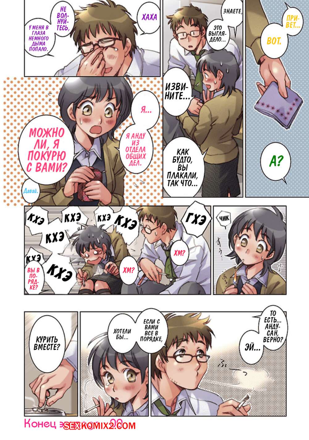 Порно комикс Дурак Любви Парень начал курить чтобы произвести впечатление на свою коллегу по работе, которую он давно желал выебать. Ему это удалось, девушка поддалась его чарам и с радостью отсосала хуй парня и дала ему себя выебать. Но также она рассказала, что уходит из компании, но парень все равно продолжил курить..