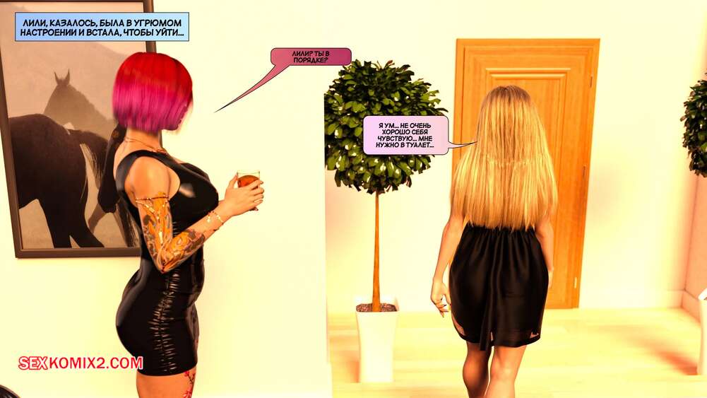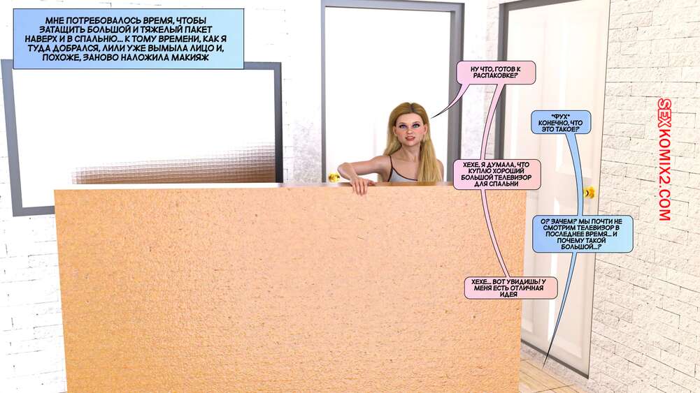 Порно комикс Новые соседи. Часть 18. The New Neighbors. Antalore42 Лили стала более развратной и купила большой телевизор. Она включила на нем порно с Аннабель, от чего у Адама встал член. Девушка разделась и отсосала хуй любимого, после чего дала ему себя выебать.