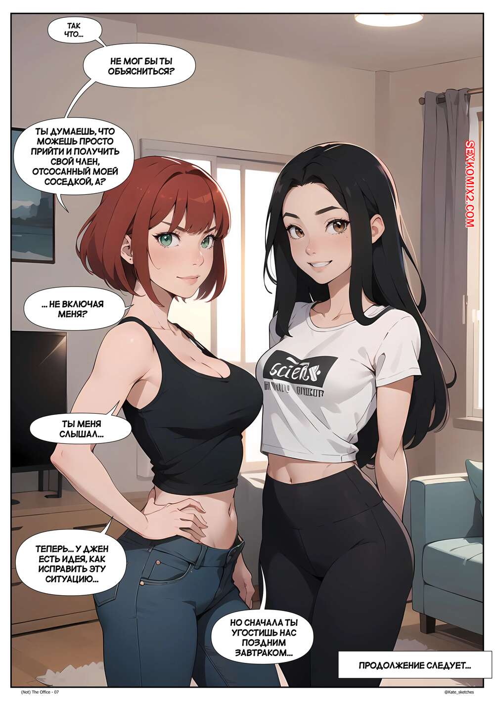 Порно комикс Не офис. Часть 7. Not The Office. Kate Sketches Горячая брюнетка была очень возбуждена перед работой и решила повеселиться со своим дружком. Она встала на колени и отсосала хуй парня, после чего дала ему себя выебать.