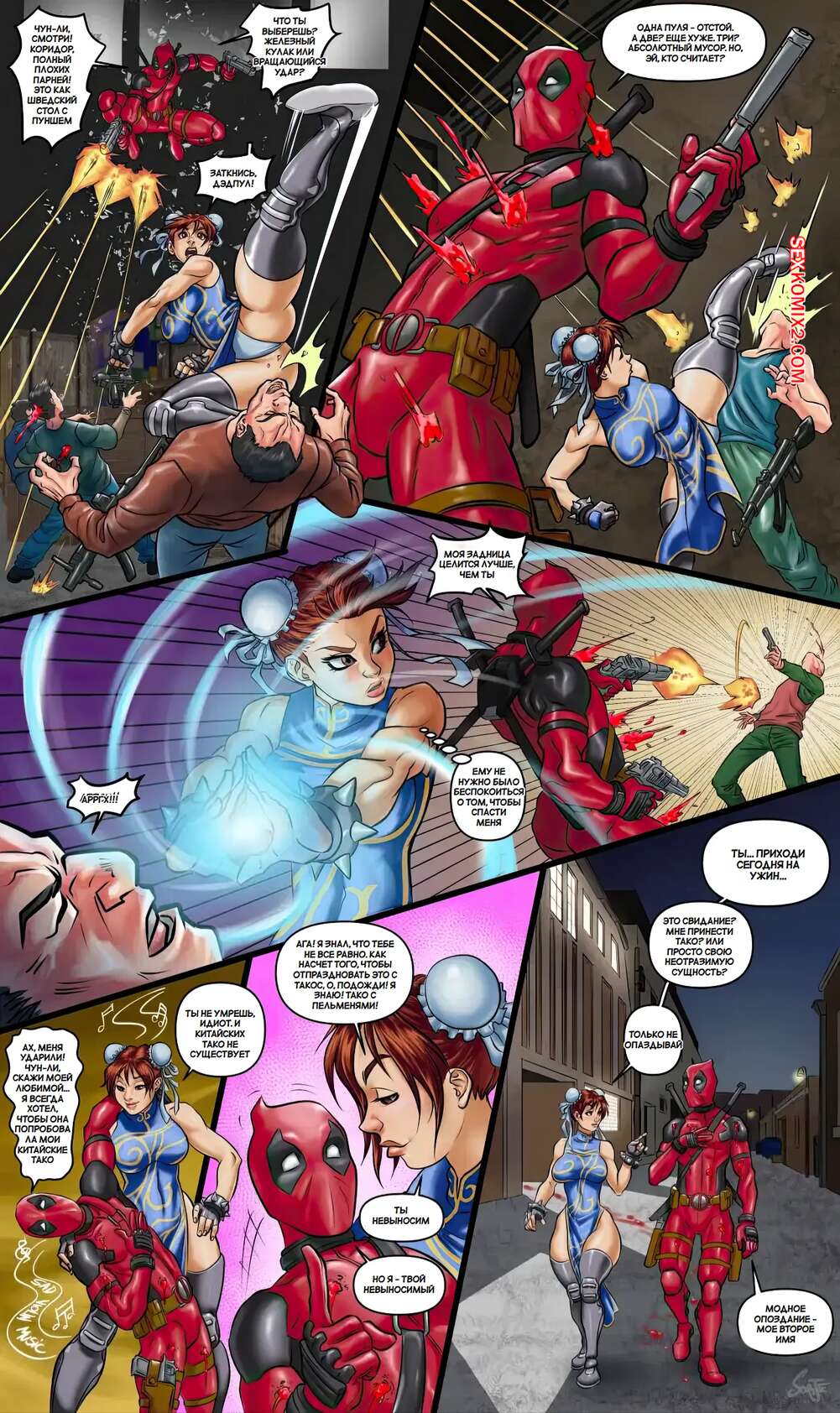 Порно комикс Marvel, Street Fighter. Дэдпул и Чун Ли. Похотливое оружие. Sorje Дэдпул и Чун Ли вместе надрали задницы бандитам, после чего решили повеселиться. Красотка разделась и отсосала хуй наемника, после чего дала ему выебать себя во все дырочки.