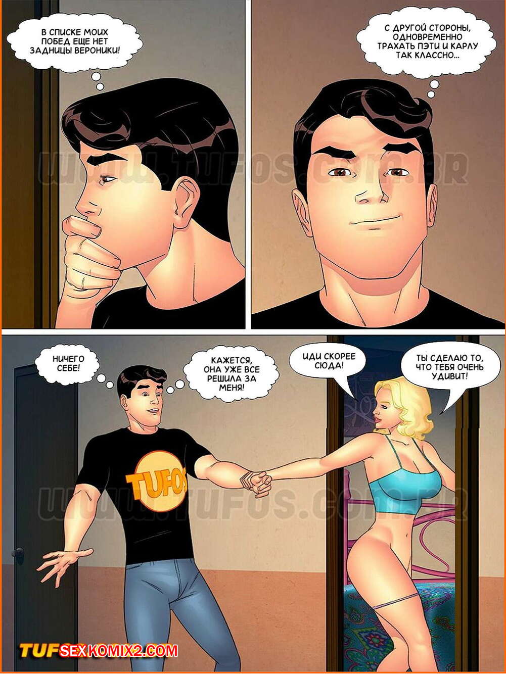 Порно комикс Тетя, кузины и племянник. Часть 24. Сперма жеребца. Николас принял приглашение на секс уже от двух девушек, и пока он думал к кому пойти, инициативу перехватила его горячая тетя и затащи парня в свою спальню.