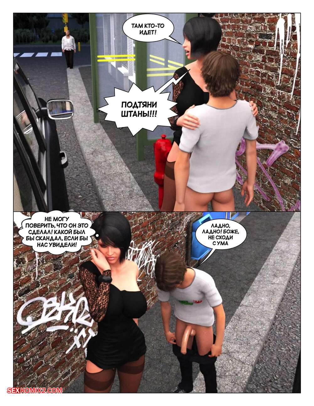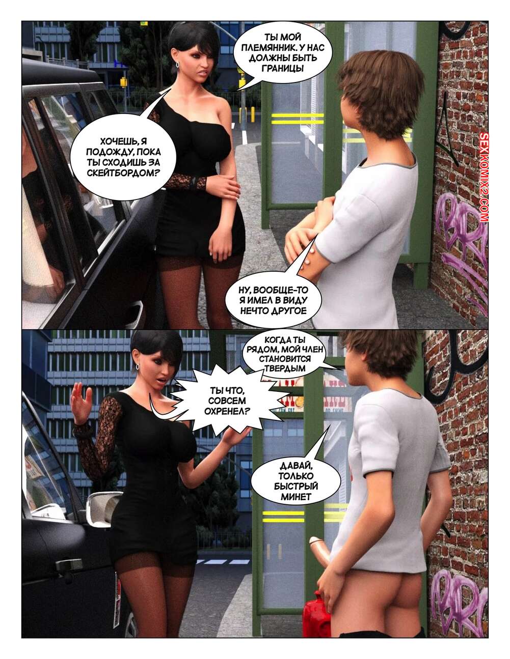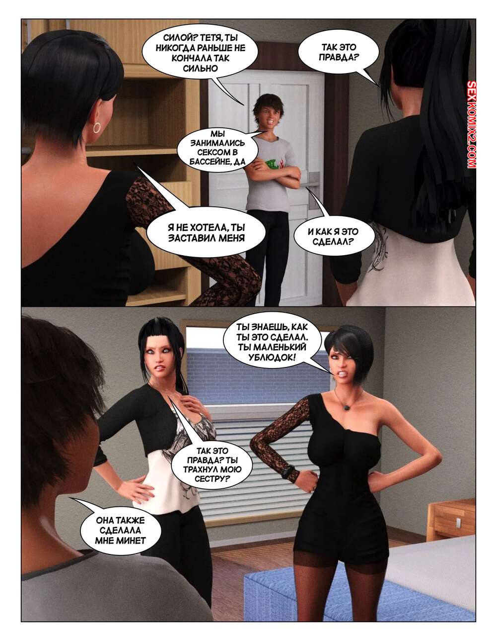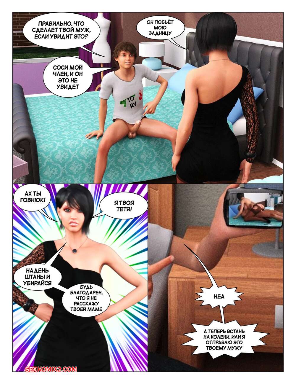 Порно комикс История инцеста. Часть 7. Тетя. Incest Story. Icstor Парнишка соблазнил свою мамку и тетю твердым членом. Красотки встали на колени и стали сосать хуй паренька, после чего раздвинули ножки и дали ему себя хорошенько выебать.