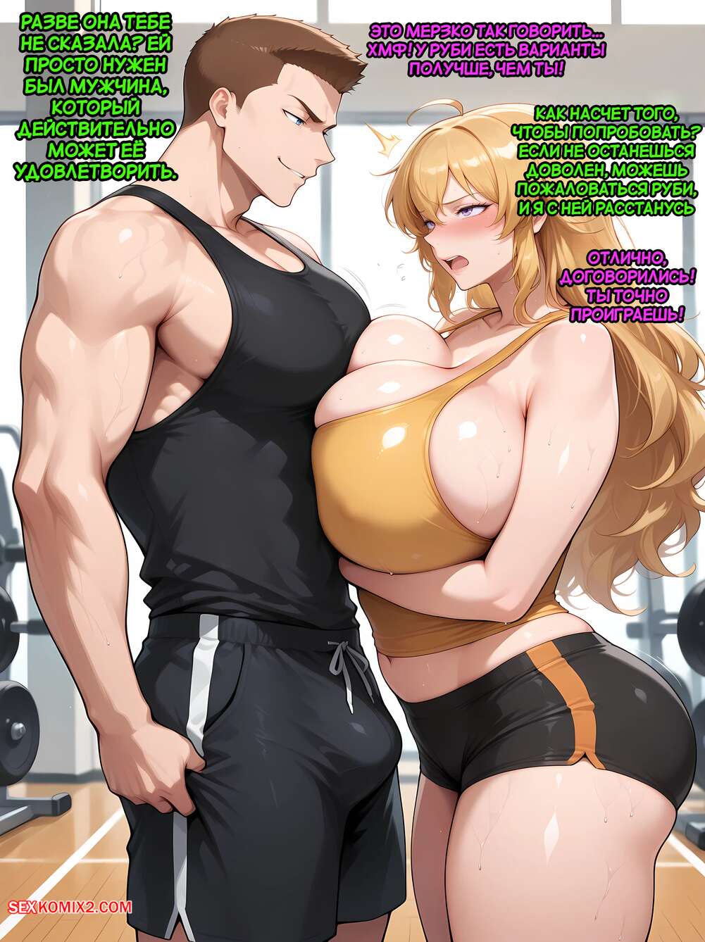 Порно комикс RWBY. Карден х Ян Сяо Лонг. Cardin x Yang Xiao Long. RazorThreat. Горячая блондинка пришла в спортивный зал позаниматься, но там на нее положил глаз паренек, который стал ласкать и возбуждать девушку. Она раздвинула ножки и дала парню себя выебать, после чего он кончил ей в пизденку.