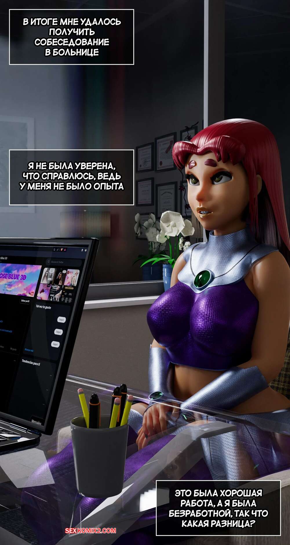 Порно комикс Teen Titans. Безработные. Часть 1. Unemployed. Rose Blue 3D. Старфайр устроилась работать медсестрой, где ее сразу приметил старик доктор. В подходящий момент он стал тереться членом о попку девушки, после чего дал ей у себя отсосать, а затем выебал ее во все дырочки.