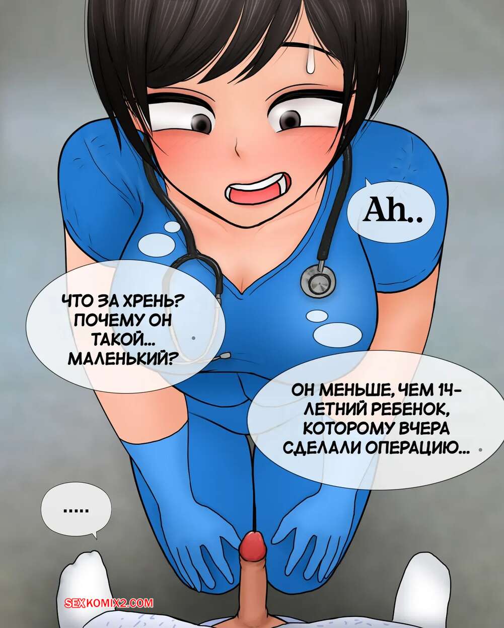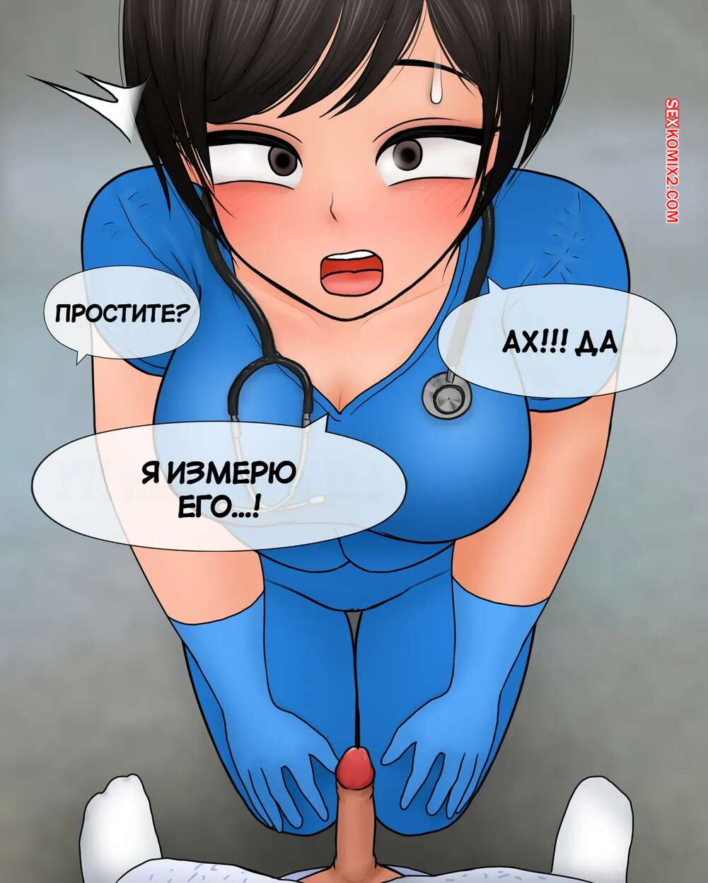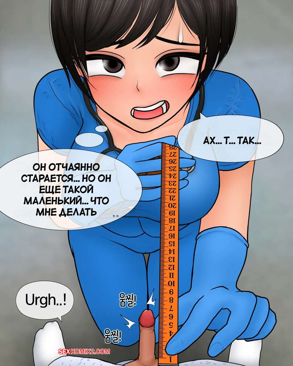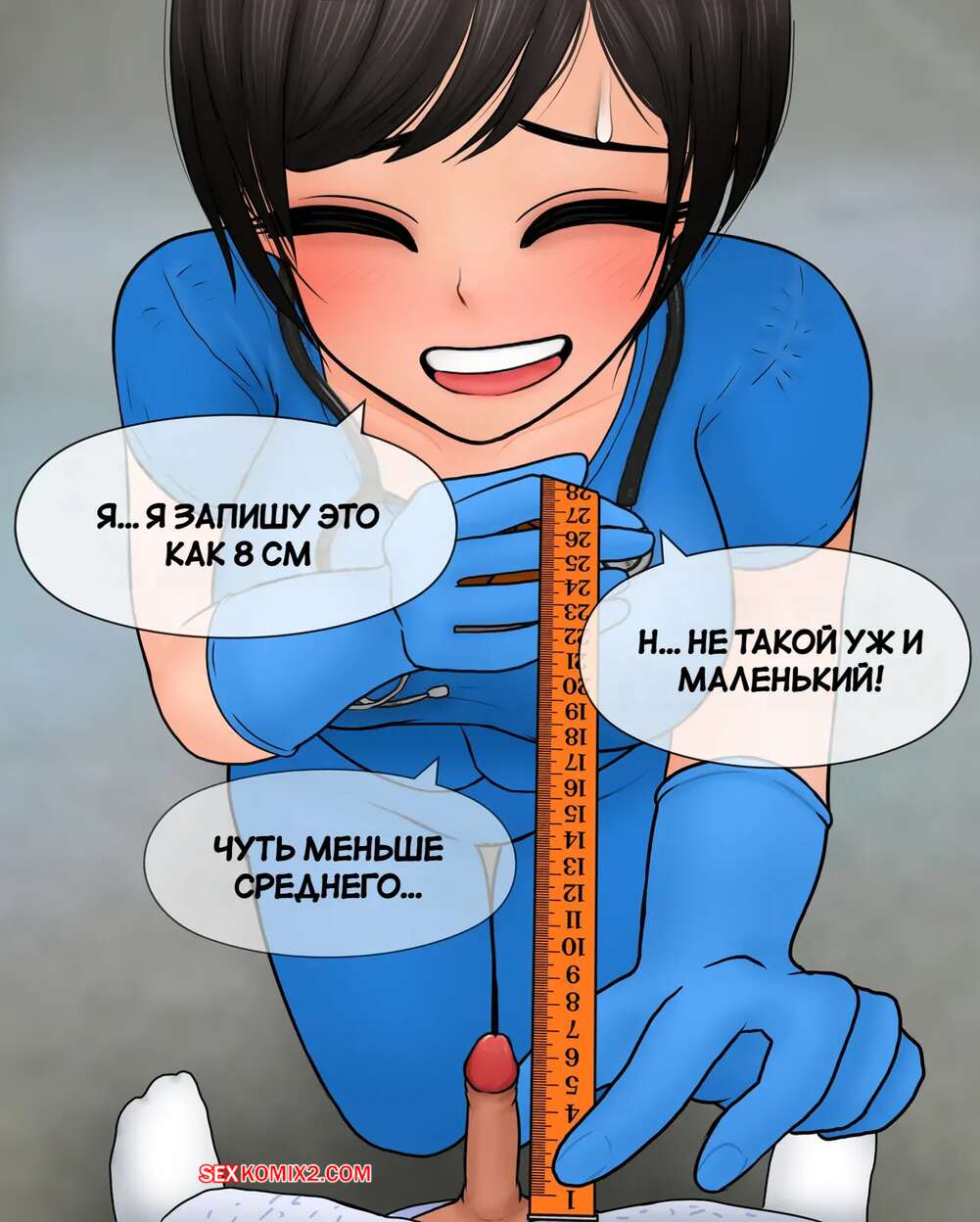 Порно комикс Медсестра замеряет размер пениса. Nurse measures penis size. Philia К горячей медсестре приходят молодые парни, чтобы измерить размер члена. Первый парнишка ее ничем не удивил, но когда к ней зашел темнокожий пацан, он вывалил перед красоткой свой огромный стояк, от чего у девушки потекли слюнки.