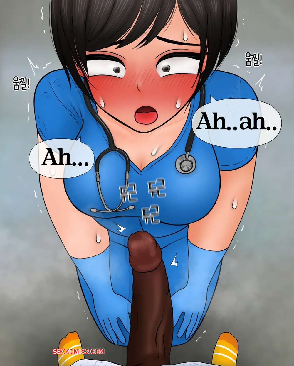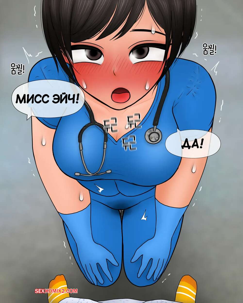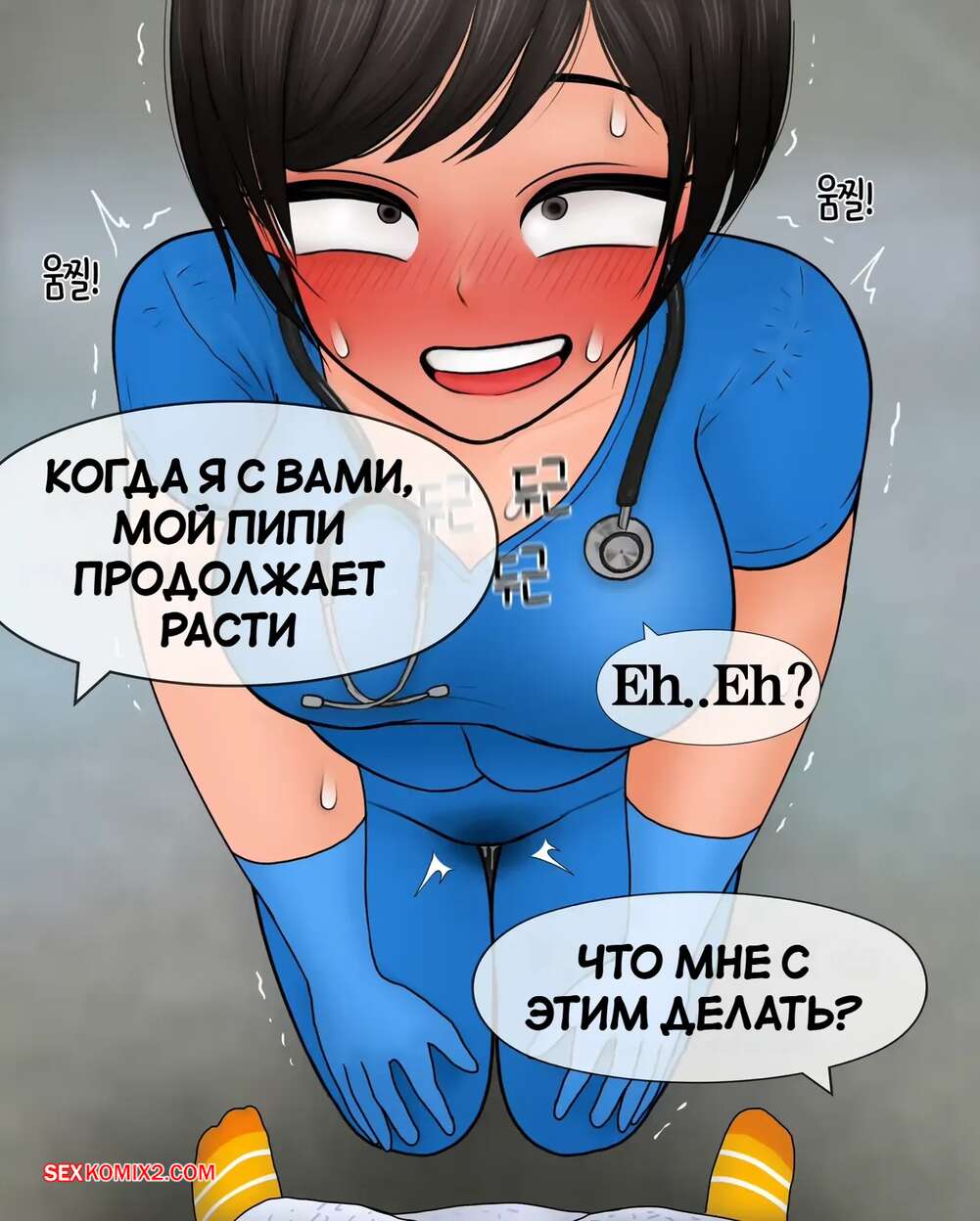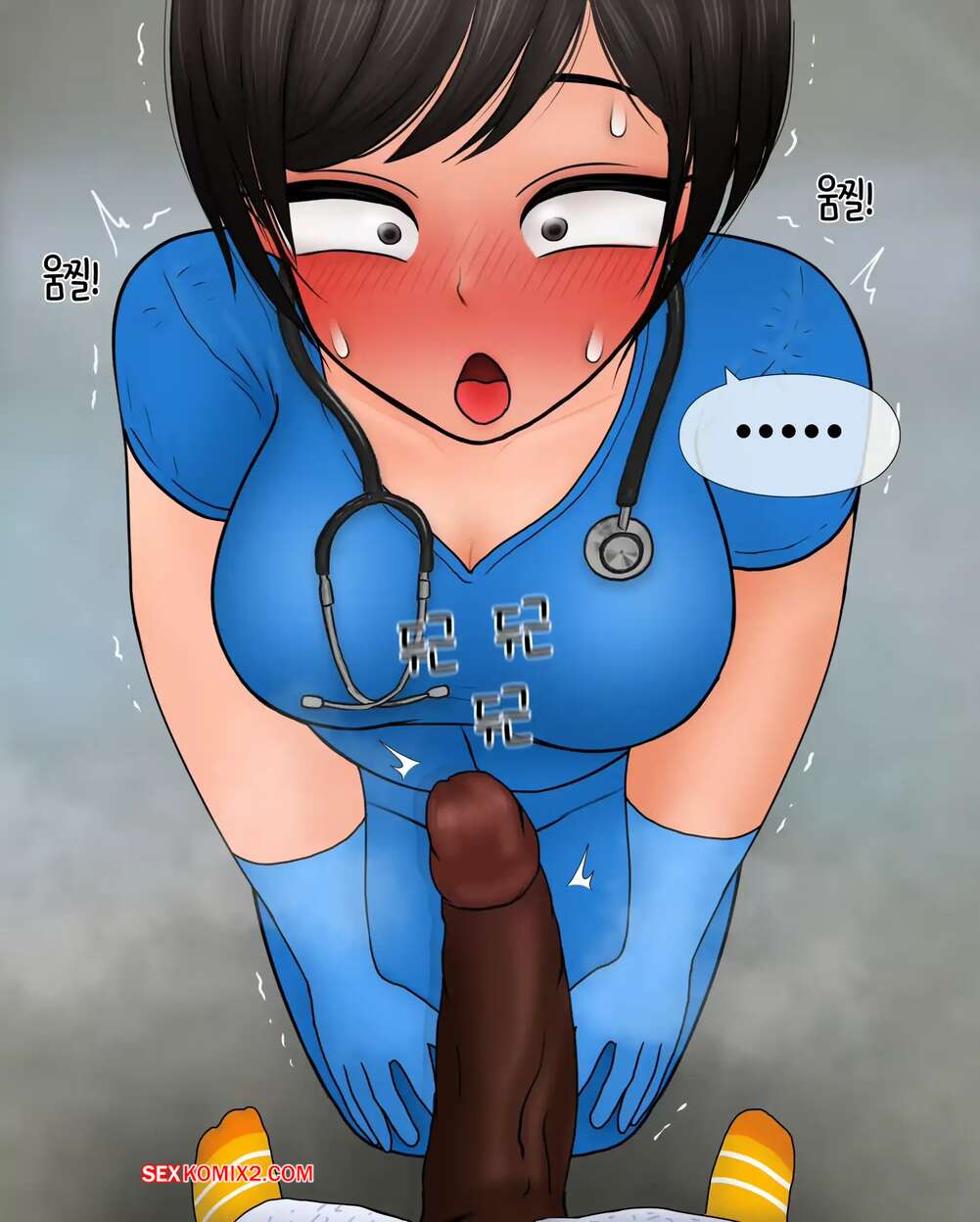 Порно комикс Медсестра замеряет размер пениса. Nurse measures penis size. Philia К горячей медсестре приходят молодые парни, чтобы измерить размер члена. Первый парнишка ее ничем не удивил, но когда к ней зашел темнокожий пацан, он вывалил перед красоткой свой огромный стояк, от чего у девушки потекли слюнки.