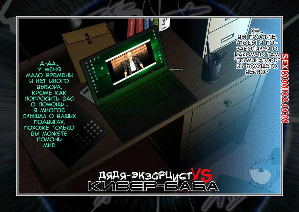 Порно комикс Дядя экзорцист VS Кибер баба Откуда невозьмись появилась девушка терминатор, которая сразу на себя примерила кожаный костюмчик. Она стала сражаться с усатым мужиком и в процессе их схватки они оба оказались голые, наша красотка показала свое классное голое тело. Мужик не стал долго думать и стал быстренько ебать такую красотку.