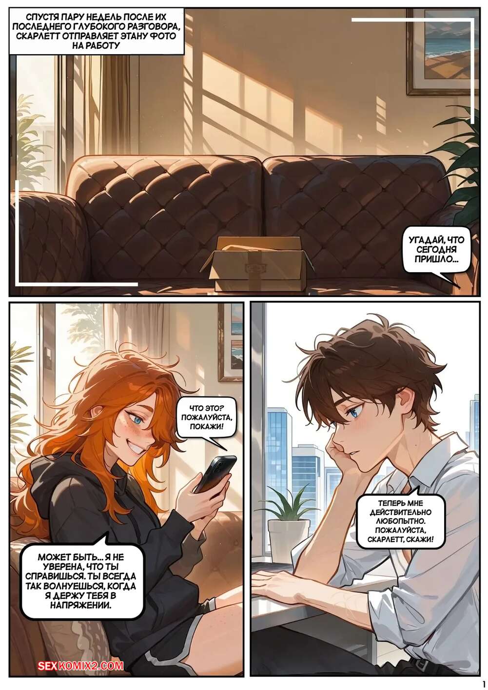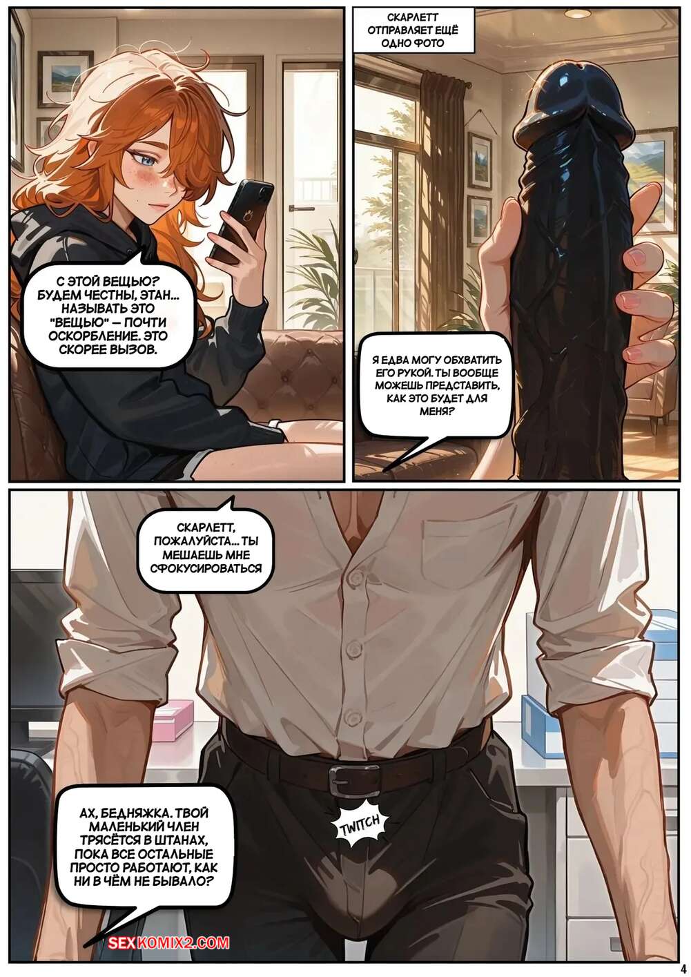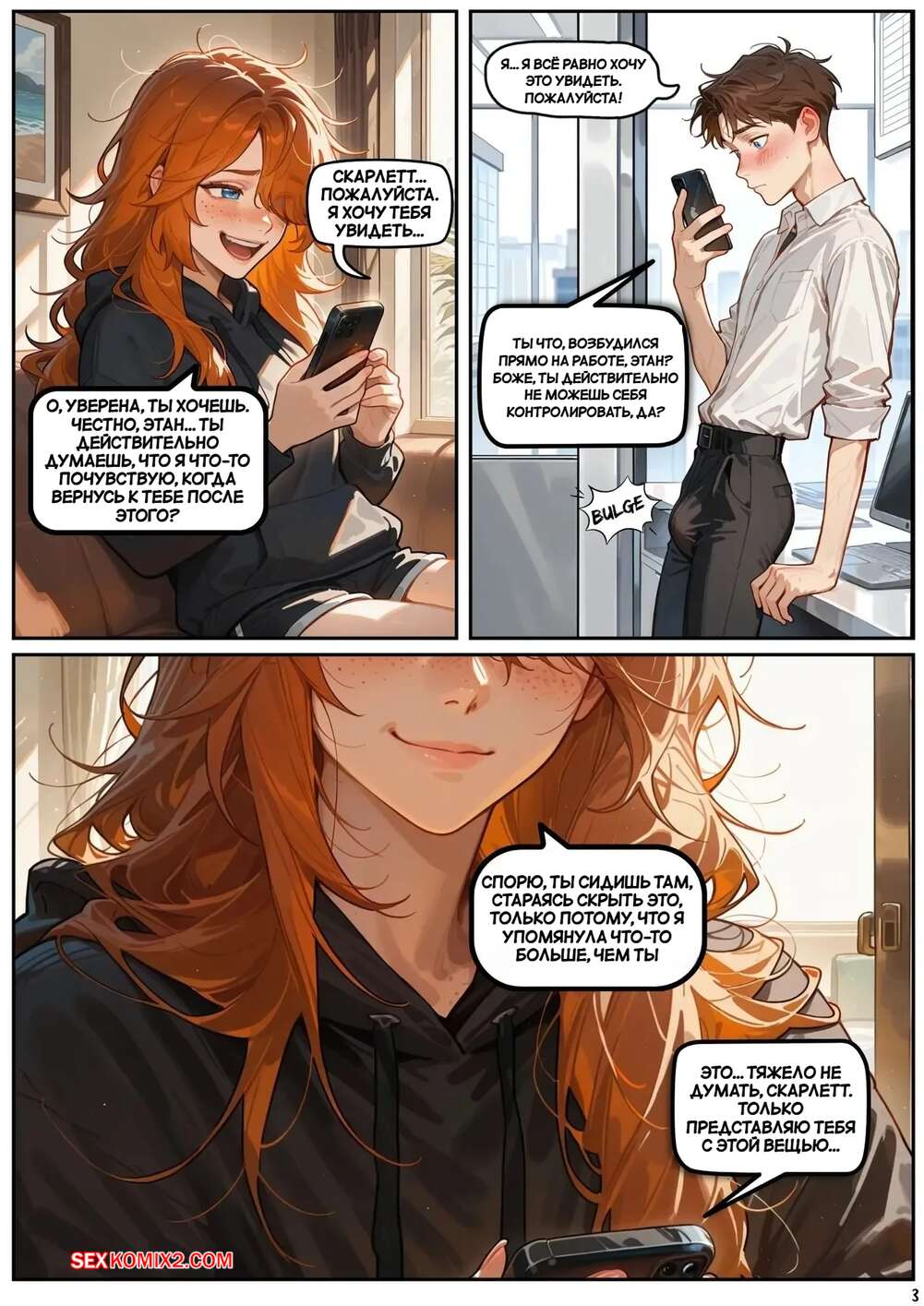 Порно комикс Скарлет Блейз. Часть 7. Scarlett Blaze Парень занят работой, но его рыжая подруга отдыхает дома и хочет кончить. Она пишет пареньку и вызывает у него стояк своими грязными разговорчиками. Девчуля стала трахать себя с помощью дилдо, после чего подоспел парень и отлизал пизденку подруги.