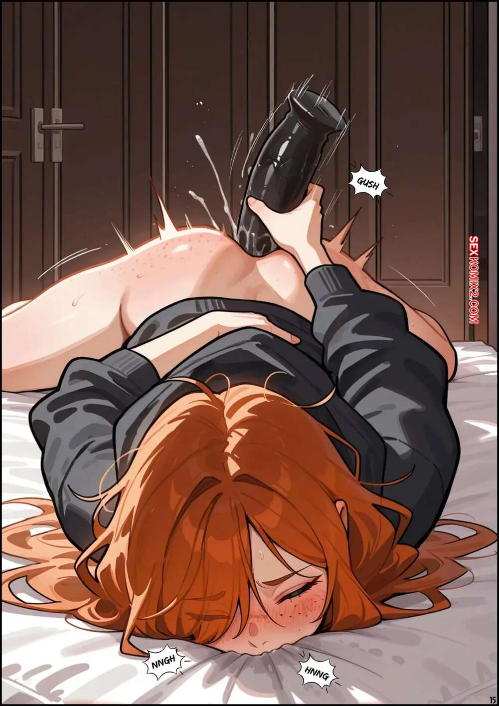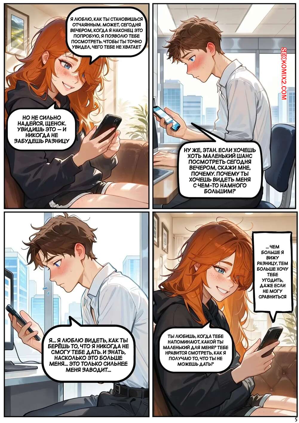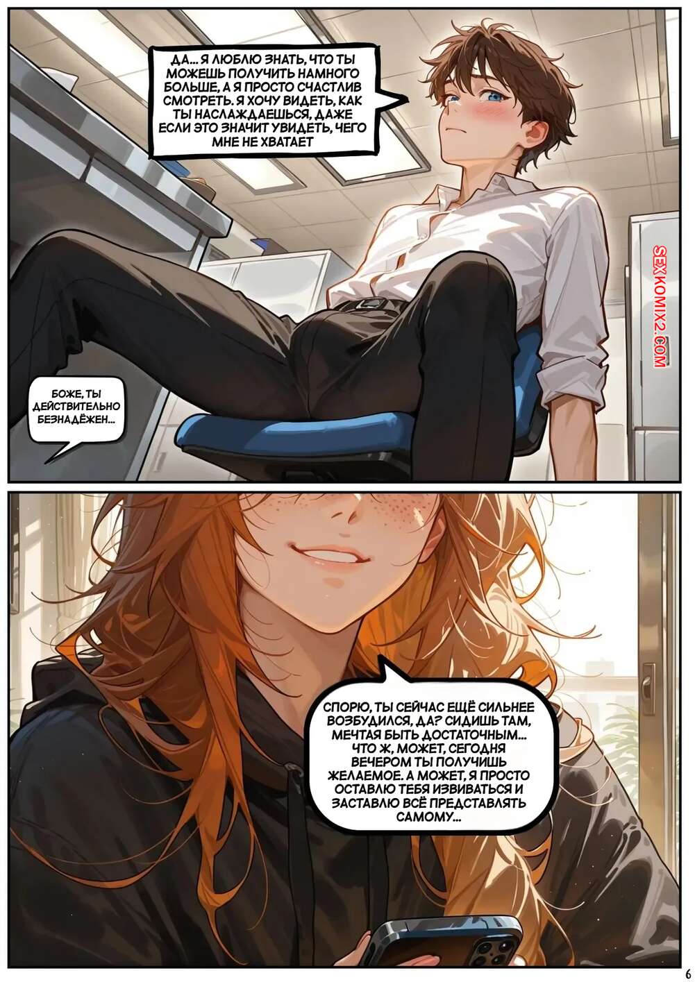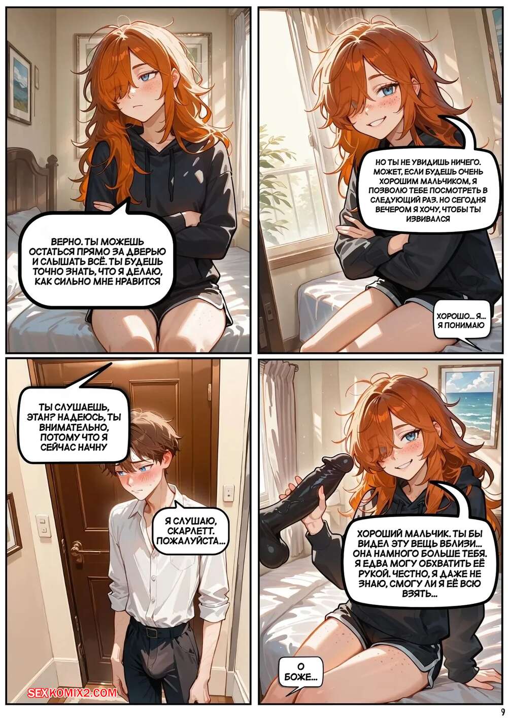 Порно комикс Скарлет Блейз. Часть 7. Scarlett Blaze Парень занят работой, но его рыжая подруга отдыхает дома и хочет кончить. Она пишет пареньку и вызывает у него стояк своими грязными разговорчиками. Девчуля стала трахать себя с помощью дилдо, после чего подоспел парень и отлизал пизденку подруги.