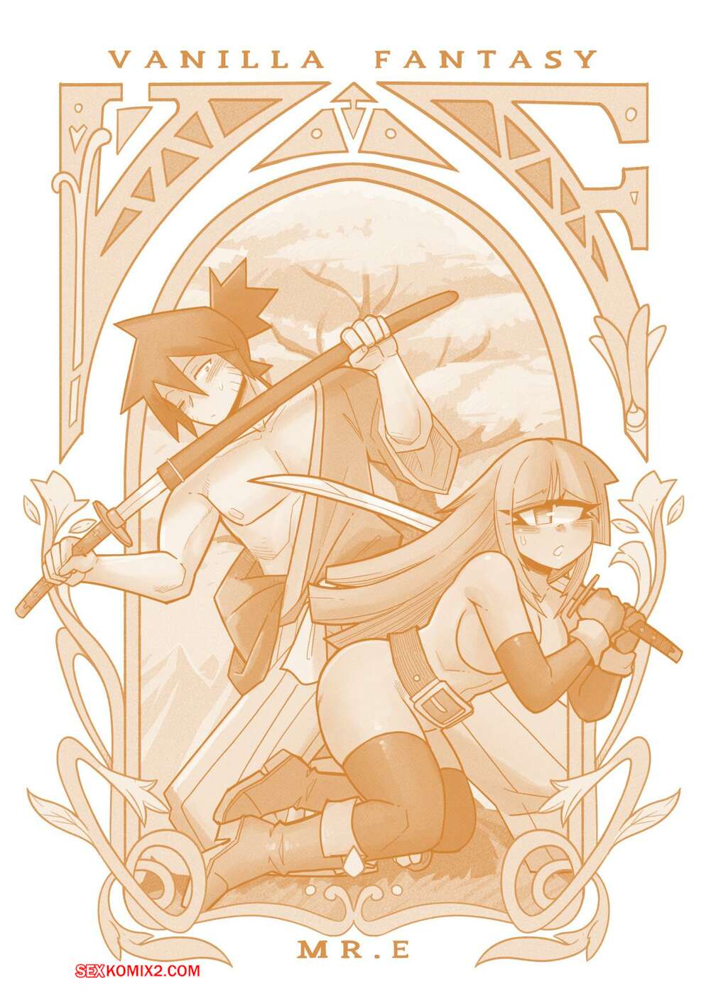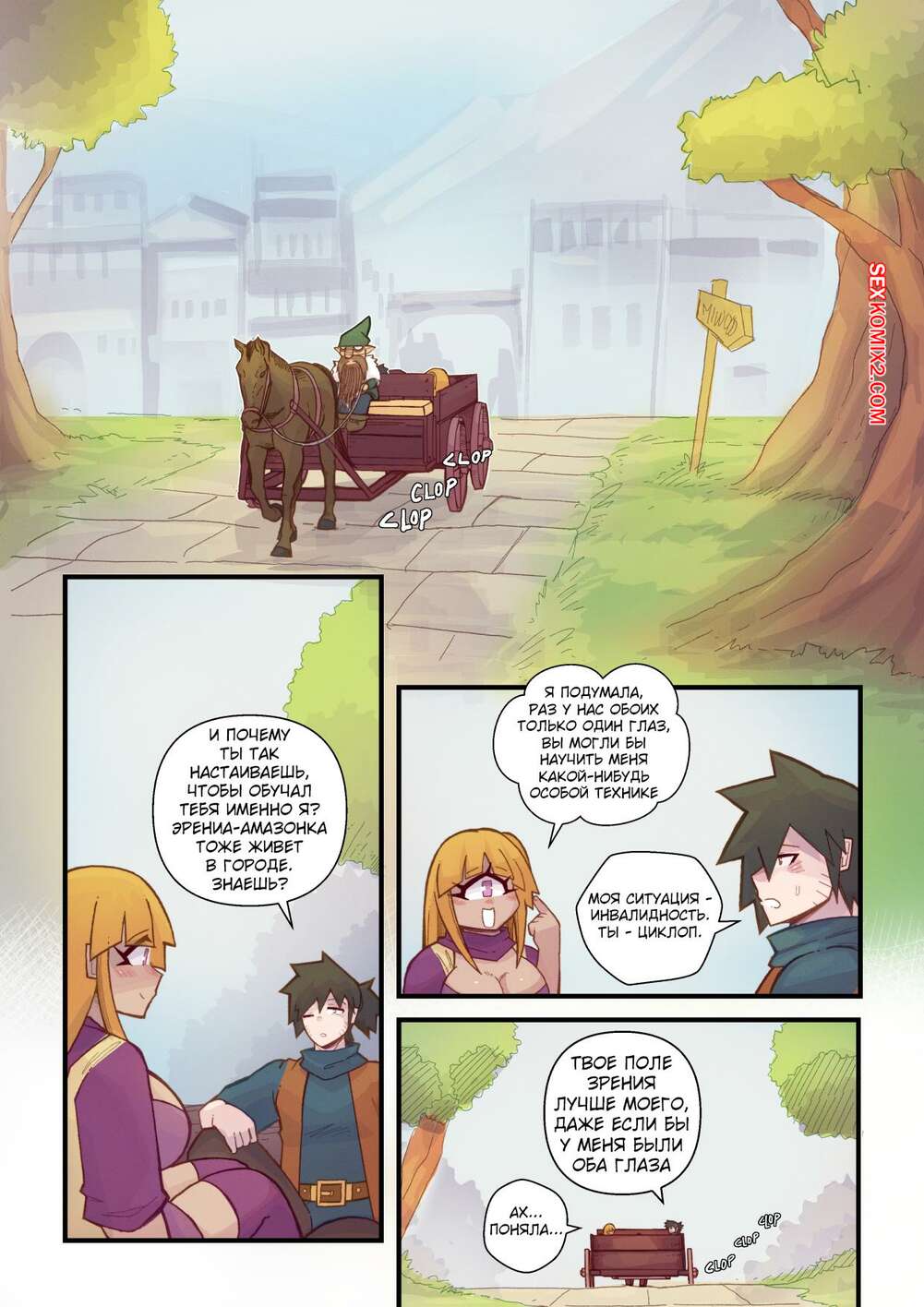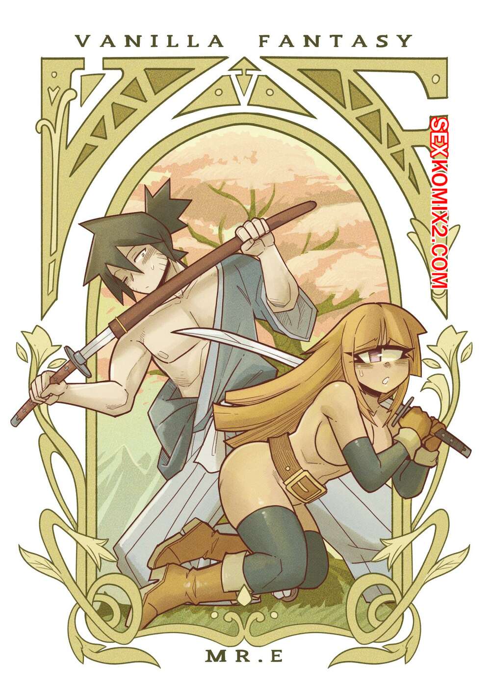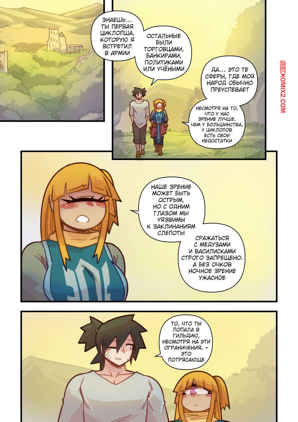 Порно комикс Ванильная фантазия. Часть 5. Vanilla Fantasy. Mr.E. В своих странствиях парень познакомился с одноглазой девушкой, она стала его оруженосцем. Со временем он влюбился в нее, после жаркой ночи секса они стали парой.