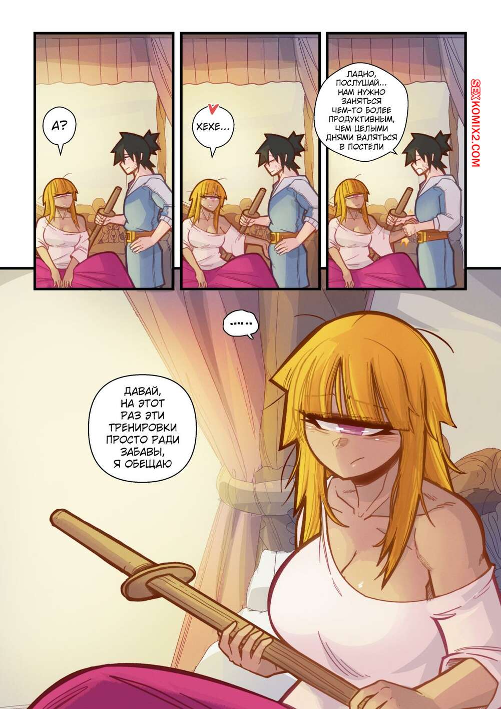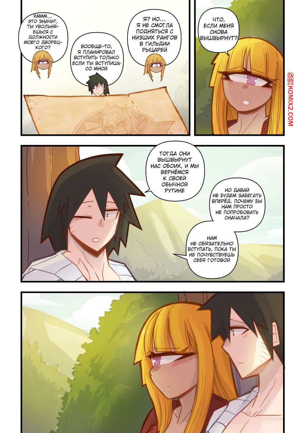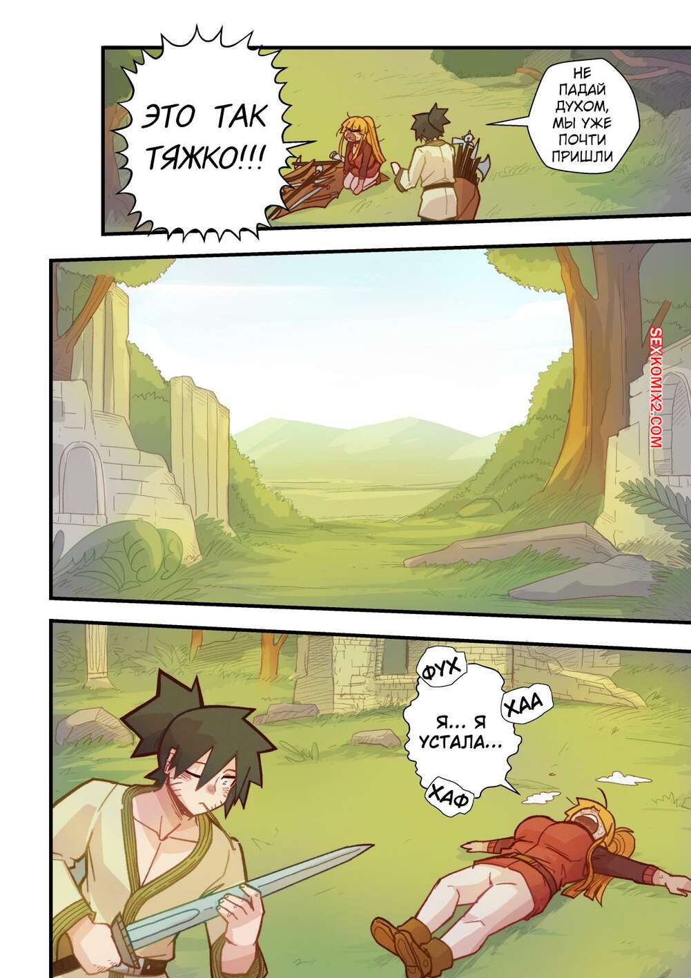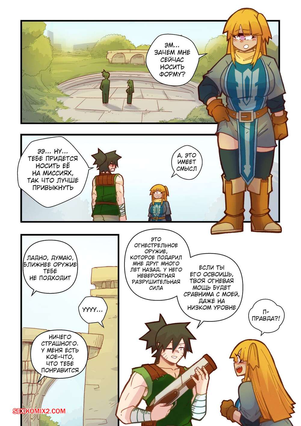 Порно комикс Ванильная фантазия. Часть 5. Vanilla Fantasy. Mr.E. В своих странствиях парень познакомился с одноглазой девушкой, она стала его оруженосцем. Со временем он влюбился в нее, после жаркой ночи секса они стали парой.