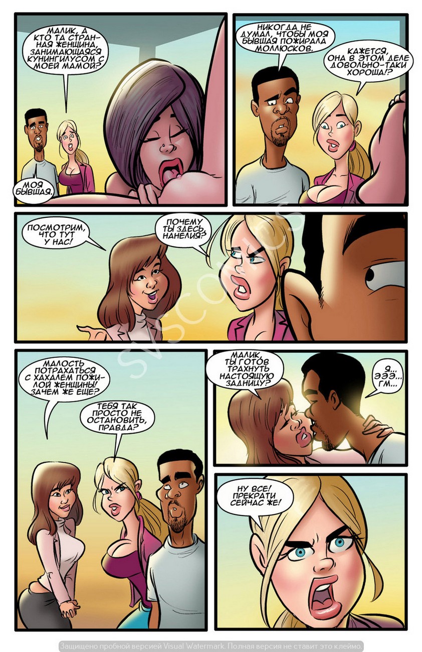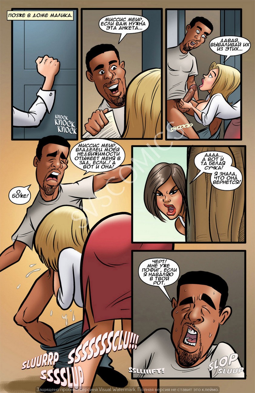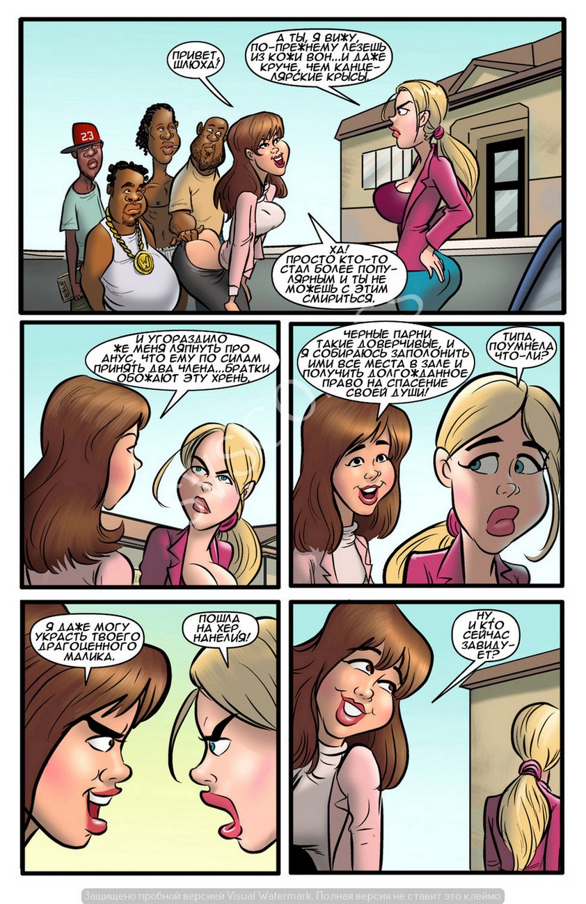 Порно комикс «Лазейка в рай. История третья». В этой части молодая и горячая блондинка, которая готовит себе дорогу в рай, делая добрые секс дела, решила действовать максимально эффективно. Она задумала ублажить сразу троих чернокожих парней, девушка сосала и лизала их огромные члены, дала себя трахнуть и даже с задницу. Парни развлеклись на славу, они и не знали, что эта сумасшедшая трахаясь с ними хочет попасть в рай. После отличной оргии красотка смыла с себя всю сперму и уверенная подла дальше творить добрые дела.