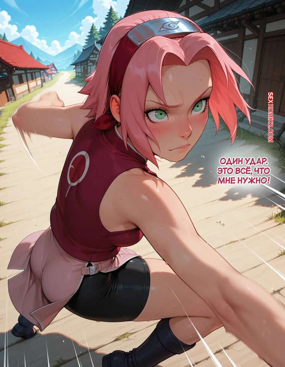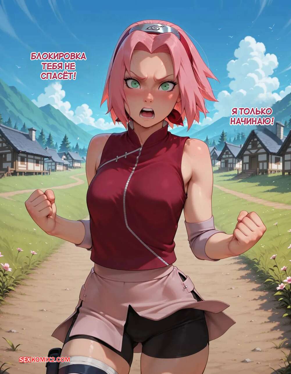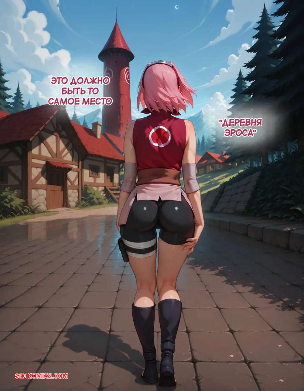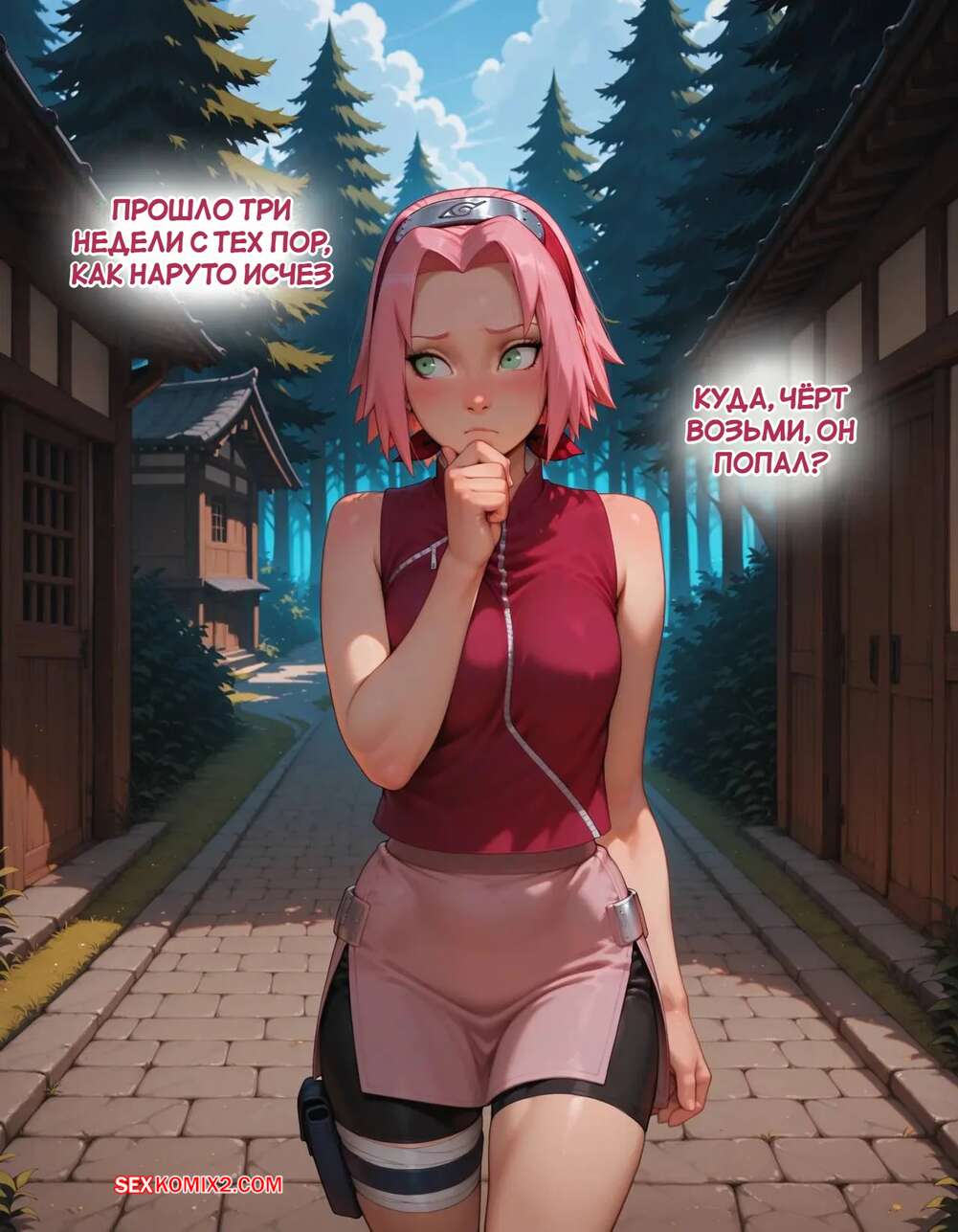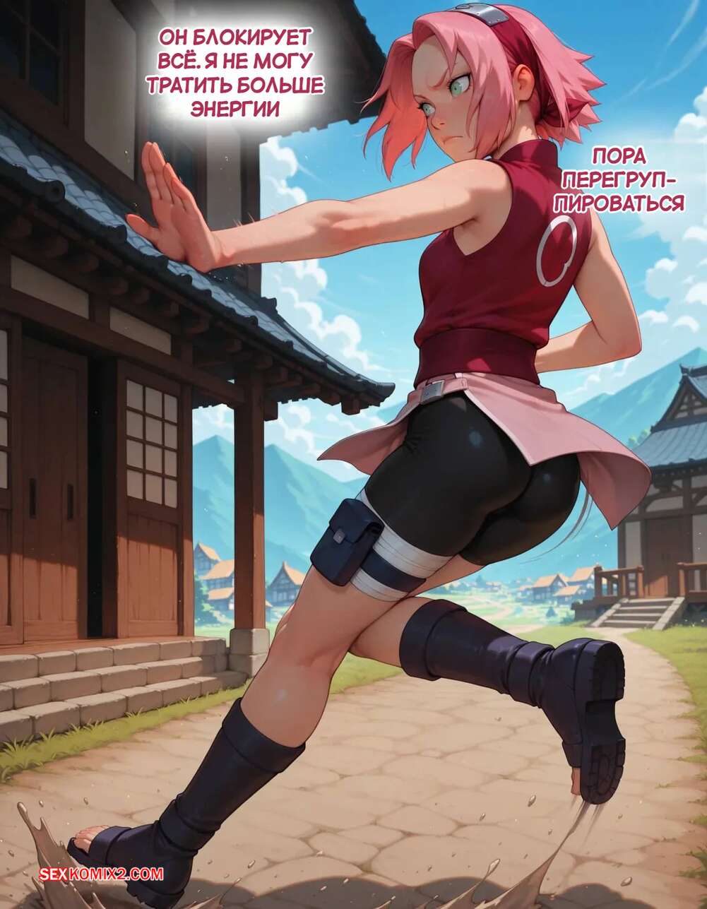 Порно комикс Наруто. Деревня Эрос. Часть 2. The Village of Eros. Sax Сакура отправилась в деревню Эрос, где она встретила на своем пути парня и вступила с ним в схватку. Он возбудил девушку и дал ей отсосать свой большой хуй, после чего как следует ее выебал.