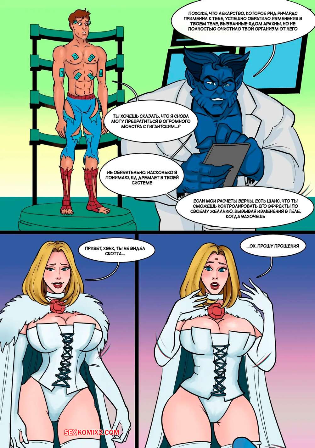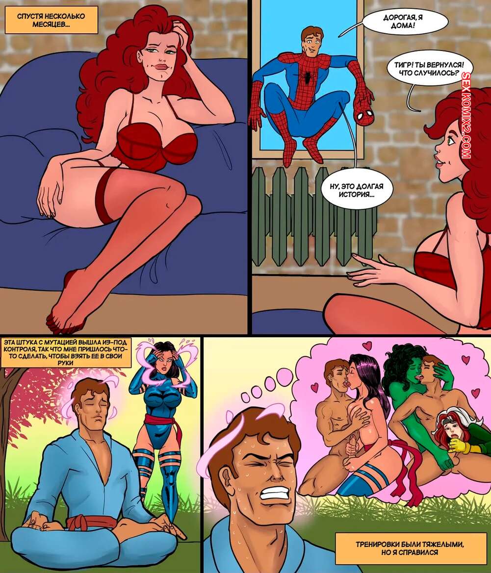 Порно комикс Человек Паук. Ненасытный Человек Паук. Часть 2. Mavis Roode С Человеком Пауком творится чтото невероятное и он постоянно возбужден. Эмма Фрост чувствует дискомфорт парня и решает ему помочь. Она раздевается и отсасывает хуй героя, после чего дает себя трахнуть.