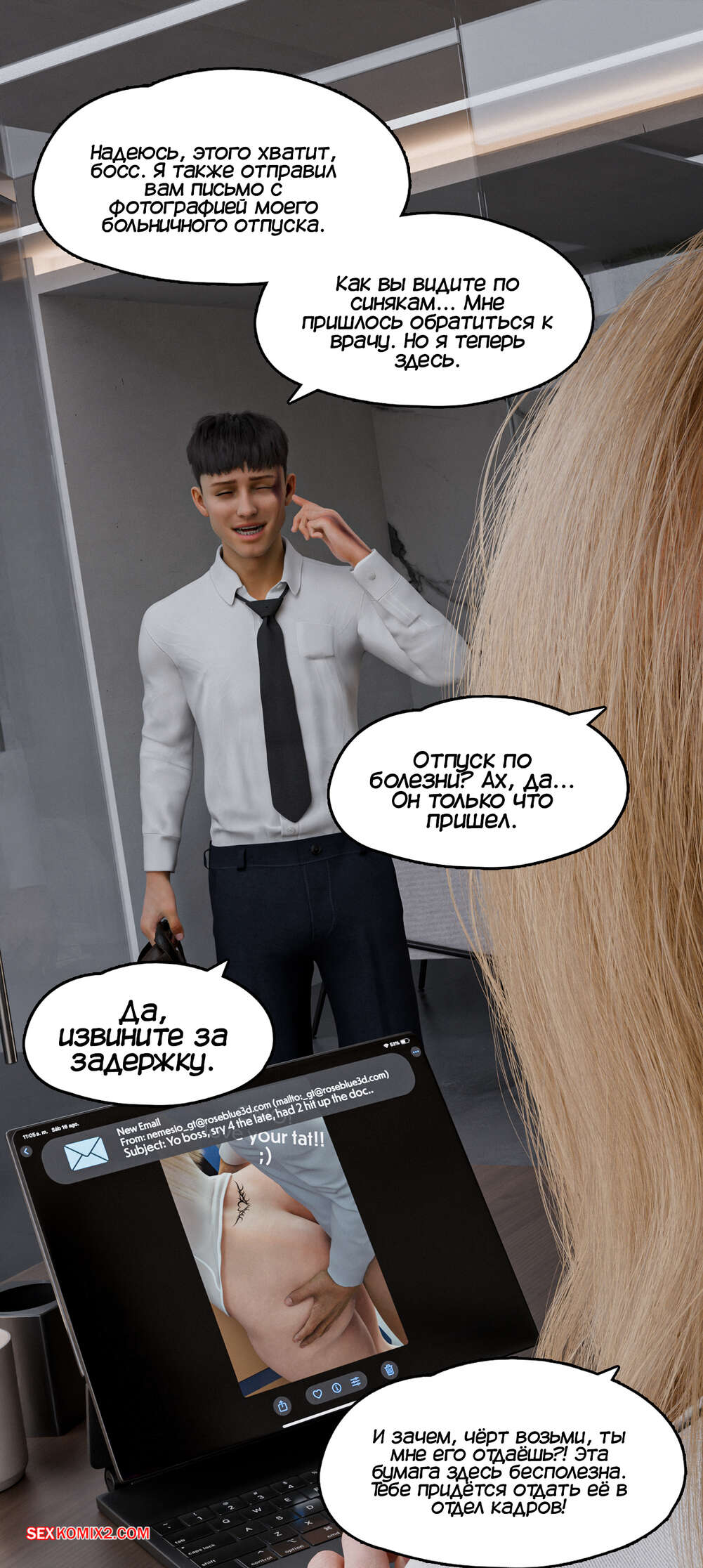 Порно комикс Свободен. Часть 4. Dismissed. Rose Blue 3D Горячая блондинка получила на свой планшет видео, на котором показано, как она трахалась со своим сотрудником. Девушка вспоминает тот день и осознает, как хорош парень.