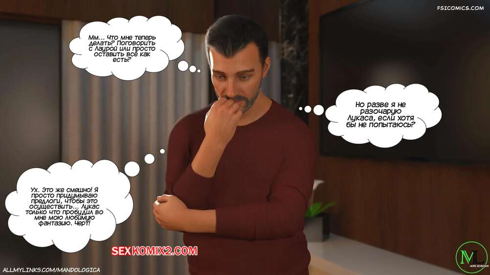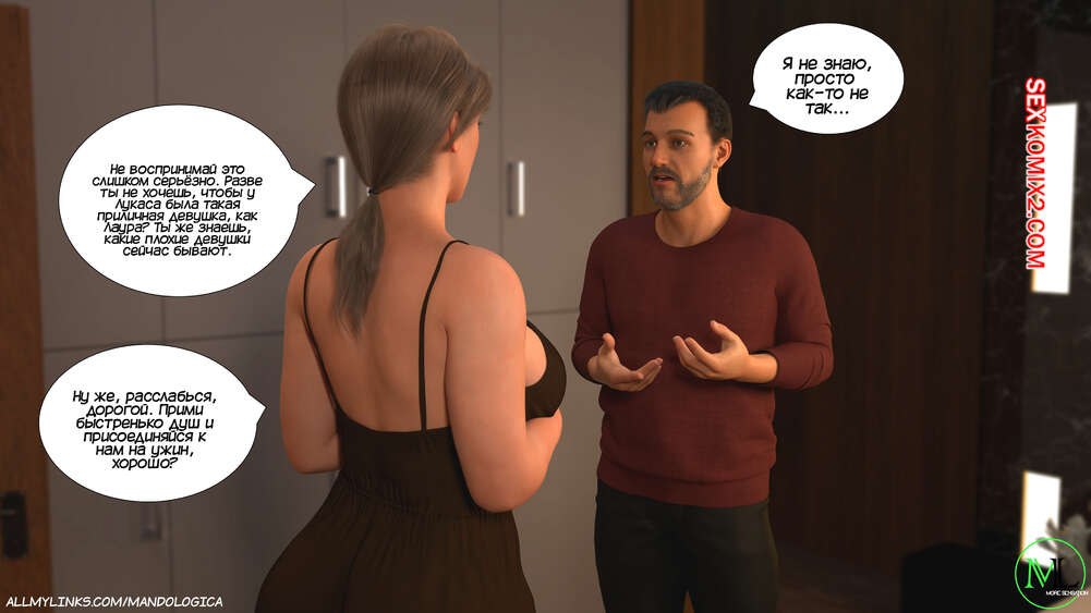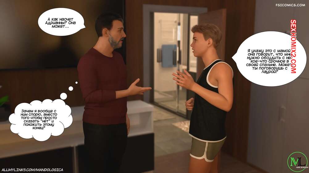 Порно комикс Разрушение границ. Часть 12. Breaking Boundaries. MandoLogica Уильям вернулся домой и его ждало неожиданное зрелище. Лаура надела сексуальный наряд, в котором прекрасно видно ее сочную попку. Мужик отправился в комнату, чтобы поговорить с Адрианной о происходящем.