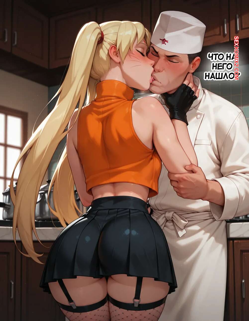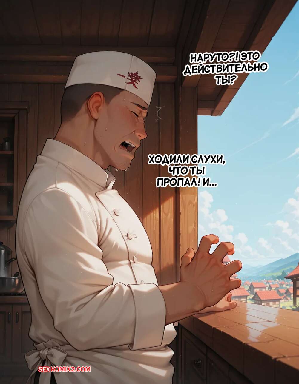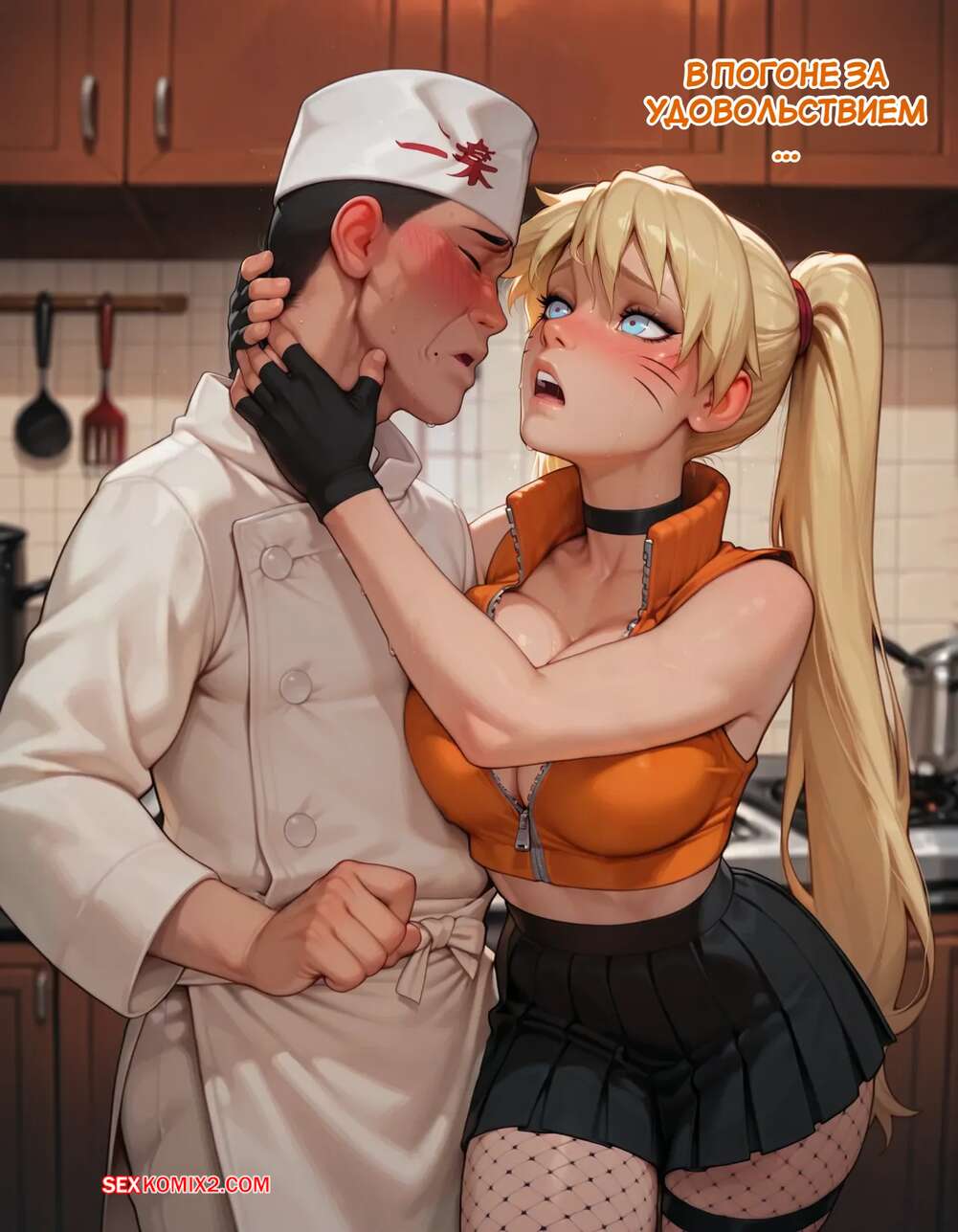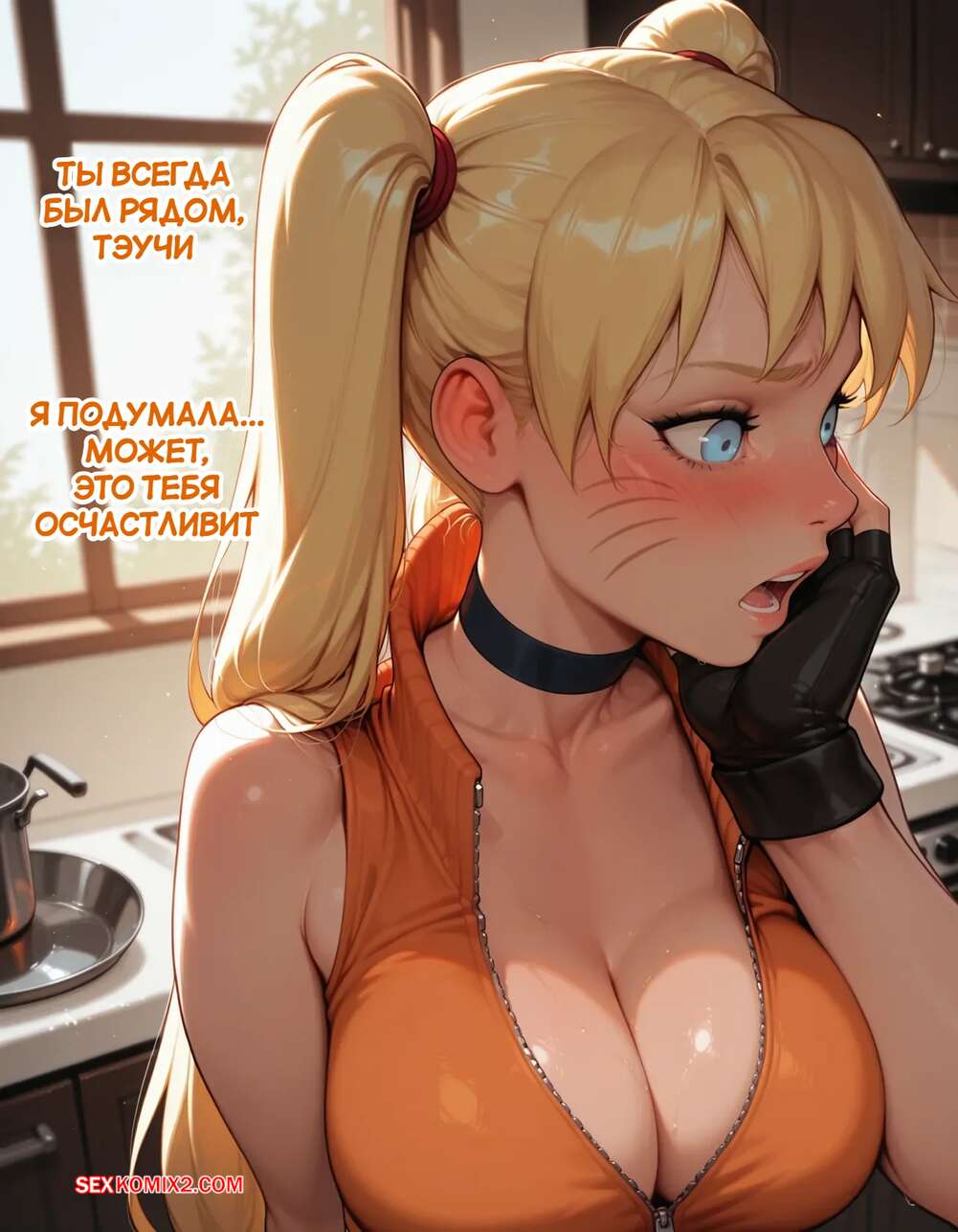 Порно комикс Наруто. Деревня Эрос. Часть 5. The Village of Eros. Sax Горячая блондинка возбуждена и решает повеселиться с парнем поваром. Она достала его член и стала его массировать, после чего встала на колени и начала дрочить его сиськами.