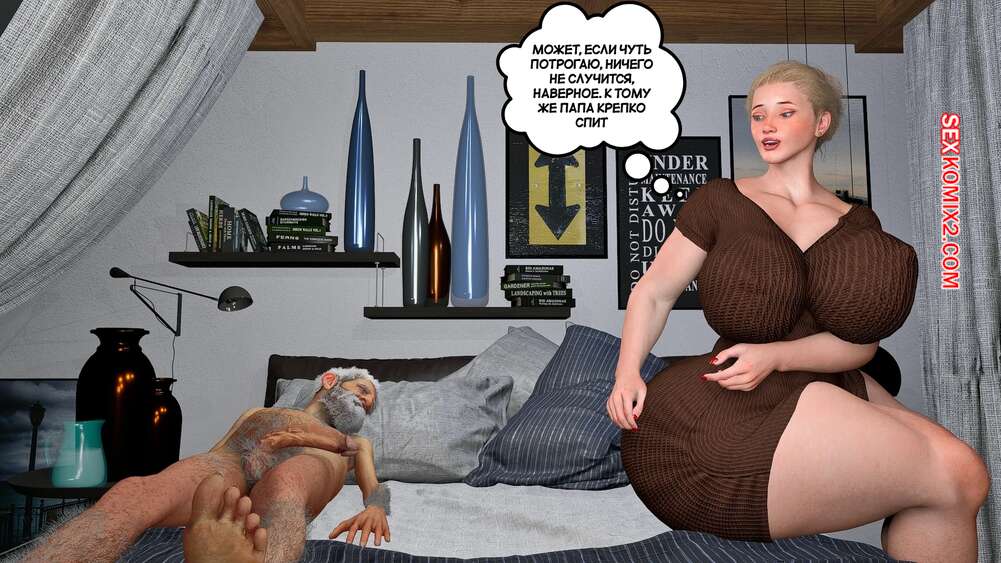 Порно комикс Забота о моем отце. Часть 2. Care my father. Bartolito3d for sexkomix2.com Горячая милфа приняла ванну и вышла в спальню к своему спящему отцу. Она была поражена его большим членом и стала его дрочить, после чего слизала сперму старика.
