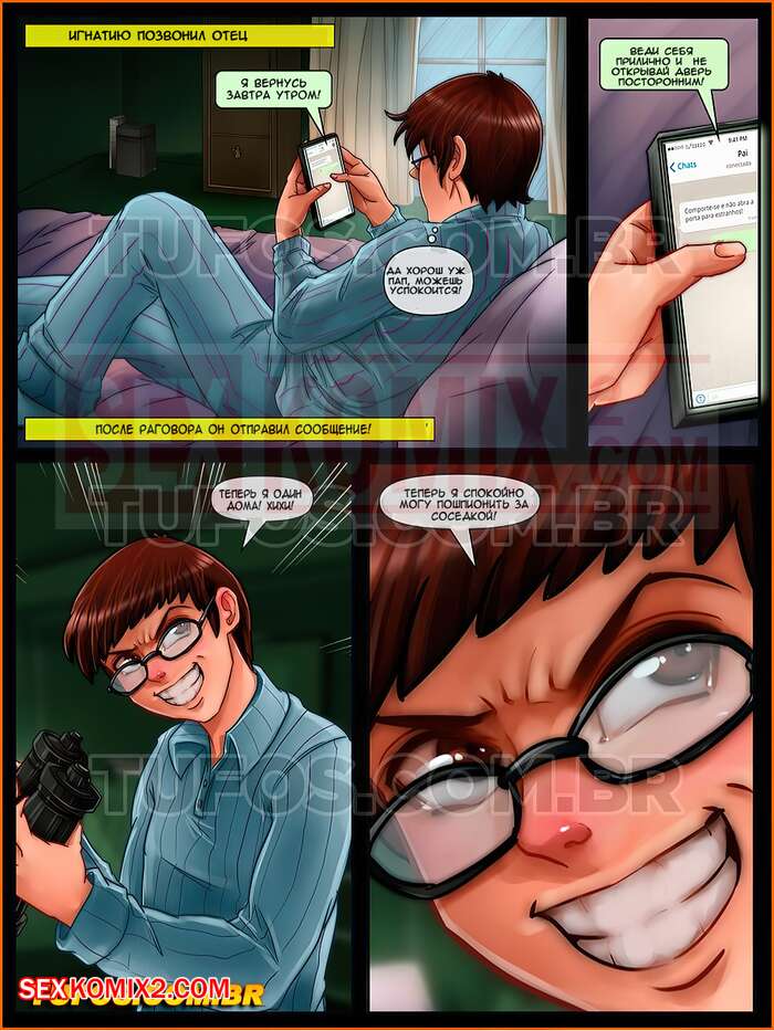 Порно комикс Необычная пара. Пуритане. Часть 2. Очень распущенная соседка. Парень остался дома один и решал подглянуть за своей горячей соседкой. Он взял бинокль и приступил к делу. Но девушка его заметила и пришла к нему, чтобы дать свое тело на пробу. Парень не ожидал такого подарка, этот вечер он запомнит на долго.